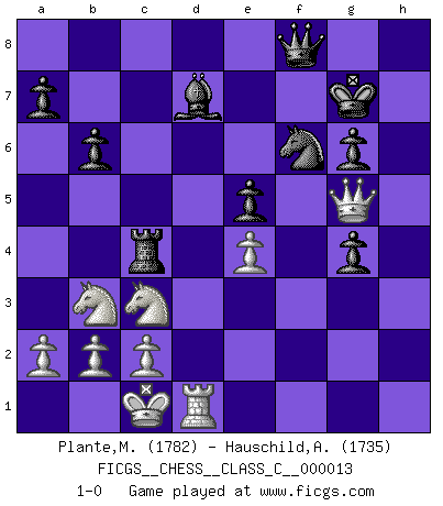 Last move : 1-0 2006 October 24 8:35:26 [Event "FICGS__CHESS__CLASS_C__000013"] [Site "FICGS"] [Date "2006.09.13"] [Round "1"] [White "Plante,Marc-Eric"] [Black "Hauschild,Achim"] [Result "1-0"] [WhiteElo "1782"] [BlackElo "1735"] 1.e4 c5 2.Nf3 d6 3.d4 cxd4 4.Nxd4 Nf6 5.Nc3 g6 6.Be3 Bg7 7.f3 O-O 8.Qd2 Nc6 9.Bc4 Bd7 10.O-O-O Rc8 11.Bb3 Ne5 12.h4 h5 13.Bh6 Nc4 14.Bxc4 Rxc4 15.Bxg7 Kxg7 16.g4 hxg4 17.h5 Rh8 18.hxg6 fxg6 19.f4 e5 20.Rxh8 Qxh8 21.Nb3 Qf8 22.fxe5 dxe5 23.Qe3 b6 24.Qg5 1-0 Sicilian : Dragon, Yugoslav attack, 7...O-O Kingside Castling by player Black (move 7) Queenside Castling by player White (move 10) Player White won this chess game. Follow this game move after move (download)No Chess Grandmaster is normal; they only differ in the extent of their madness. (Viktor Korchnoi) Bis zum Jahr 1971 verlief in meiner Schachkariere alles glatt. Dieses dramatische Match [Fischer-Taimanov 6:0] machte mein Leben zur Hölle. (Mark Taimanov) Bobby Fischer es el jugador de Ajedrez mas grande que jamás haya existido. (Ken Smith) Les échecs sont plus proches de l'art de l'assassinat que de l'art de la guerre. (Arturo Perez-Reverte) Wawaweewa ! (Borat: Cultural learnings of America for make benefit glorious nation of Kazakhstan)
