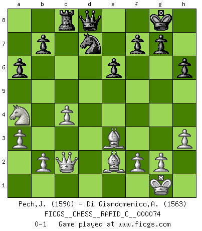 Last move : 0-1 2009 September 5 15:58:35 [Event "FICGS__CHESS__RAPID_C__000074"] [Site "FICGS"] [Date "2009.05.24"] [Round "1"] [White "Pech,Jaroslav"] [Black "Di Giandomenico,Alfonso"] [Result "0-1"] [WhiteElo "1590"] [BlackElo "1563"] 1.e4 c5 2.Nf3 e6 3.d4 cxd4 4.Nxd4 d6 5.c4 Nf6 6.Nc3 a6 7.Be2 Be7 8.O-O Bd7 9.Nf3 Nc6 10.h3 O-O 11.Be3 Rc8 12.Qc2 Na5 13.e5 dxe5 14.Nxe5 Nc6 15.Nxd7 Nxd7 16.Rad1 Qc7 17.Rd2 Rfd8 18.Rfd1 h6 19.a3 Bc5 20.Rxd7 Rxd7 21.Rxd7 Qxd7 22.Bxc5 Ne5 23.Na4 Qd8 24.Be3 Nd7 0-1 Sicilian defense Kingside Castling by player White (move 8) Kingside Castling by player Black (move 10) Player Black won this chess game. Follow this game move after move (download)Chess is a more highly symbolic game, but the aggressions are therefore even more frankly represented in the play. It probably began as a war game; that is, the representation of a miniature battle between the forces of two kingdoms. (Karl Meninger) Vielleicht wirkt die Aura früherer Spieler glanzvoller als die der heutigen Spieler, aber das liegt daran, dass man kein Programm wie Fritz hatte, das einem all die Löcher in ihren Partien zeigt. (Vladimir Kramnik) Aunque la mayoría de la gente disfruta observar las partidas de los grandes Maestros de ataque, algunos de los jugadores mas notables en la historia han sido los jugadores silenciosos posicionales. Lentamente ellos te aplastan despojandote de tu espacio, congestionando tus piezas y dejandote virtualmente sin nada que hacer. (Yasser Seirawan) 'L'échange des dames est un coup dur pour les deux adversaires...' Un journaliste lors d'une partie du match Spassky-Fischer May I never be complete. May I never be content. May I never be perfect. Deliver me, Tyler, from being perfect and complete. (Chuck Palahniuk, Fight Club)
