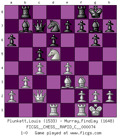 Last move : 1-0 2009 August 9 0:43:47 [Event "FICGS__CHESS__RAPID_C__000074"] [Site "FICGS"] [Date "2009.05.24"] [Round "1"] [White "Plunkett,Louis"] [Black "Murray,Findlay"] [Result "1-0"] [WhiteElo "1533"] [BlackElo "1648"] 1.c4 c5 2.Nf3 Nc6 3.d4 cxd4 4.Nxd4 g6 5.e4 Bg7 6.Be3 Nf6 7.Nc3 O-O 8.Be2 d6 9.O-O a6 10.Nxc6 bxc6 11.Qd2 Rb8 12.b3 Bb7 13.Rad1 c5 14.Bf3 Nd7 15.Qc2 Qc7 16.Nd5 1-0 This chess game has been lost on time (started : 2009.05.24 18:6:50) English : Symmetrical variation Kingside Castling by player Black (move 7) Kingside Castling by player White (move 9) Player White won this chess game. Follow this game move after move (download)One of these modest little moves may be more embarrassing to your opponent than the biggest threat. (Siegbert Tarrasch) Eine Person mit durchschnittlichem IQ kann etwa eine ELO von 2000 erreichen. (Jonathan Levitt) No es suficiente ser un buen jugador, se debe también de jugar bién. (Siegbert Tarrasch) Toute estimation doit être constamment réévaluée. (Jacob Estrin) Tree pose grows confidence. It roots me to this world. (Terri Guillemets)