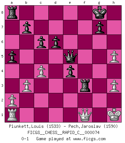 Last move : 0-1 2009 October 1 11:40:39 [Event "FICGS__CHESS__RAPID_C__000074"] [Site "FICGS"] [Date "2009.05.24"] [Round "1"] [White "Plunkett,Louis"] [Black "Pech,Jaroslav"] [Result "0-1"] [WhiteElo "1533"] [BlackElo "1590"] 1.c4 e5 2.Nc3 Nc6 3.Nf3 f5 4.g3 Nf6 5.d3 d6 6.e4 Be7 7.Bg2 fxe4 8.dxe4 Be6 9.b3 O-O 10.Bg5 Nd7 11.Bxe7 Qxe7 12.Nd5 Qd8 13.O-O a5 14.Qd2 Nc5 15.Ng5 Bg4 16.h3 Bh5 17.f4 h6 18.g4 hxg5 19.gxh5 gxf4 20.Kh1 Ne6 21.Bf3 Ncd4 22.Bg4 c6 23.Nc3 Nc5 24.Qd1 Qf6 25.Ne2 Nxe4 26.Qd3 Nxe2 27.Bxe2 Ng3+ 28.Kh2 e4 29.Qb1 f3 30.Bxf3 Nxf1+ 31.Qxf1 Qe5+ 32.Kh1 Rxf3 0-1 English : Three knights system Kingside Castling by player Black (move 9) Kingside Castling by player White (move 13) Player Black won this chess game. Follow this game move after move (download)Fischer was a master of clarity and a king of artful positioning. His opponents would see where he was going but were powerless to stop him. (Bruce Pandolfini) Frage des Reporters: -Worin besteht das Ziel von Gambiteröffnungen? Antwort: -Auf Kosten der Partie einen Ruf als Angriffspieler zu erwerben.- (Siegbert Tarrasch) Al jugar al Ajedrez entonces, podemos aprender: Primero: Previsión... Segundo: Prudencia... Tercero: Cautela... Y al final, aprendemos del Ajedrez el hábito de no ser desanimados por apariencias malas presentes en el estado de nuestros asuntos, el hábito de la esperanza por una oportunidad favorable y la perseveración de los secretos de los recursos. (Benjamin Franklin) Vous savez, camarade Pachman, je n'éprouve pas de plaisir à être ministre, je jouerais plutôt aux échecs comme vous, ou alors ferais une révolution au Venezuela. (Che Guevara à Ludek Pachman, 'Checkmate in Prague', 1975) The message for business people contemplating their place in the cyberspace is simple and direct: get linked or get lost. (Vic Sussman and Kenan Pollack)