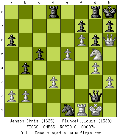 Last move : 0-1 2009 August 29 10:24:48 [Event "FICGS__CHESS__RAPID_C__000074"] [Site "FICGS"] [Date "2009.05.24"] [Round "1"] [White "Jenson,Chris"] [Black "Plunkett,Louis"] [Result "0-1"] [WhiteElo "1635"] [BlackElo "1533"] 1.e4 c5 2.Nc3 Nc6 3.g3 e6 4.Bg2 a6 5.d3 g6 6.Be3 Qa5 7.Qd2 Bg7 8.Nge2 Nf6 9.h3 O-O 10.Bh6 b5 11.O-O b4 12.Nd1 Nh5 13.g4 Nf6 14.Bxg7 Kxg7 15.Ne3 Qd8 16.f4 d5 17.e5 Ne8 18.Rae1 Qh4 19.c4 Nc7 20.cxd5 exd5 21.Nxd5 Nxd5 22.Bxd5 Bb7 23.Bg2 Rad8 24.Qe3 Qe7 25.Ng3 Nd4 26.Bxb7 Qxb7 27.f5 Nc2 28.f6+ Kh8 29.Qh6 Rg8 30.Ne4 Nxe1 31.Ng5 Qg2+ 0-1 Sicilian : Closed Kingside Castling by player Black (move 9) Kingside Castling by player White (move 11) Player Black won this chess game. Follow this game move after move (download)It's always better to sacrifice your opponent's men. (Savielly Tartakover) Wer wird heute Abend ihr Gegner sein? -- Heute Abend spiele ich gegen die schwarzen Steine. (Akiba Rubinstein) En el Ajedrez, tal como en la vida, las bendiciones de hoy pueden ser el veneno del mañana. (Assaic) Il n'y a plus de joueurs du niveau de Jacob Murray dont la seule quête est le beau jeu, le plaisir de voir les pièces construire quelque chose. Sur 10 idées à la minute, 9 seront sans intérêt, la dernière s'avèrera géniale. (Christian Bauer) Hold em is to stud what chess is to checkers. (Johnny Moss)