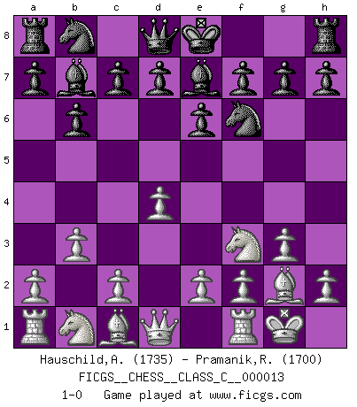 Last move : 1-0 2006 November 10 21:59:49 [Event "FICGS__CHESS__CLASS_C__000013"] [Site "FICGS"] [Date "2006.09.13"] [Round "1"] [White "Hauschild,Achim"] [Black "Pramanik,Ranadeep"] [Result "1-0"] [WhiteElo "1735"] [BlackElo "1700"] 1.Nf3 Nf6 2.d4 e6 3.g3 b6 4.Bg2 Bb7 5.O-O Be7 6.b3 1-0 This chess game has been lost on time (started : 2006.09.13 0:8:16) Reti Opening Kingside Castling by player White (move 5) Player White won this chess game. Follow this game move after move (download)Live, lose, and learn, by observing your opponent how to win. (Amber Steenbock) Wie ich sie so einen nach dem anderen nieder mähte wurde meine Überlegenheit offensichtlich. (José Raúl Capablanca) El Ajedrez es la vida. (Bobby Fischer) En blitz, le Cavalier l'emporte sur le Fou. (Vlastimil Hort) Pushing plastic is for the many, pushing virtual pieces is for the fewer, pushing wood is for the very few. (Normajean Yates)