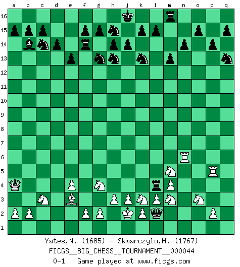 Last move : 0-1 2009 November 1 8:3:58 [Event "FICGS__BIG_CHESS__TOURNAMENT__000044"] [Site "FICGS"] [Date "2009.05.25"] [Round "1"] [White "Yates,Normajean"] [Black "Skwarczylo,Marek"] [Result "0-1"] [WhiteElo "1685"] [BlackElo "1767"] 1.m2-m4 j15-k13 2.p1-o3 h16-o10 3.h2-g4 o10-c10 4.j2-k4 c10-c2 5.b1-c3 c2-l10 6.l2-l3 e15-e13 7.n2-n4 f16-c13 8.g1-f3 d15-d14 9.e2-e4 b16-c14 10.d2-d4 m15-m13 11.h1-p8 l16-o13 12.g4-j5 n15-n14 13.o1-l4 h15-g13 14.l4-o7 l10-m11 15.p8-a8 k16-h15 16.f1-c4 p16-o14 17.l1-q6 m11-q7 18.a8-o8 q7-n4 19.q1-n1 n4-g10 20.f3-h4 c16-k9 21.o7-m5 k9-j8 22.c4-b5 g10-f11 23.m5-j8 o13-j8 24.c1-m10 j8-p14 25.j5-g4 g16-j15 26.n1-n11 f11-d9 27.m1-n1 d9-d4 28.a1-d1 d4-b4 29.e1-e2 o16-l13 30.n11-n5 c13-b14 31.b5-d7 e16-e14 32.n5-b5 b4-f8 33.n1-n8 f8-f10 34.b5-f5 f10-c7 35.m10-f4 c7-k14 36.f5-k5 e14-f14 37.f4-l9 f14-f7 38.d7-e8 f7-a7 39.j1-j2 a16-e16 40.l9-e3 a7-a5 41.k5-a5 k14-a5 42.n8-n5 a5-j13 43.o8-o6 l13-k12 44.q6-k12 j13-k12 45.n5-k5 k12-j11 46.o6-c6 j11-p11 47.k5-p5 p11-k6 48.d1-d6 k6-c13 49.c6-a4 m16-m14 50.d6-c6 c13-h8 51.e8-j4 q16-m16 52.c6-h6 h8-o8 53.k1-m2 e16-e14 54.e2-e1 e14-f14 55.e1-n1 m14-l14 56.n1-n8 o8-o7 57.n8-n6 p14-k9 58.j4-k3 k9-n6 59.h6-n6 o7-b7 60.n6-b6 b7-n7 61.k4-m5 n7-q10 62.q2-q4 o14-q13 63.o3-n5 q10-q4 64.m2-o3 q4-o2 65.b6-n6 p15-p14 66.k3-l4 j15-h13 67.n5-m3 o2-l2 68.h4-k3 l14-l4 0-1 This big chess game has been lost on time (started : 2009.05.25 10:34:49) Follow this game move after move (download)The Pin is mightier than the sword. (Fred Reinfeld) Schach ist das schnellste Spiel der Welt, weil man in jeder Sekunde Tausende von Gedanken ordnen muß. (Albert Einstein) El Ajedrez se juega con la mente... ¡no con las manos!. (Renaud y Kahn) La vie et les Echecs sont tous les deux une lutte constante. (Lasker) A journey of a thousand sites begins with a single click. (Author unknown)