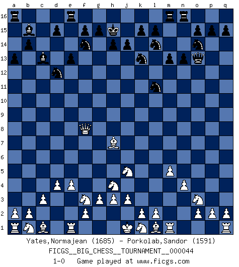 Last move : 1-0 2009 August 24 9:20:32 [Event "FICGS__BIG_CHESS__TOURNAMENT__000044"] [Site "FICGS"] [Date "2009.05.25"] [Round "1"] [White "Yates,Normajean"] [Black "Porkolab,Sandor"] [Result "1-0"] [WhiteElo "1685"] [BlackElo "1591"] 1.j2-h4 p16-o14 2.h1-l4 k16-l14 3.l4-c12 h15-g13 4.c12-c15 b16-c14 5.c15-g11 j15-k13 6.h2-g4 h16-o10 7.p1-o3 n15-n13 8.g1-f3 o16-h10 9.g11-g6 m15-m13 10.c2-c3 l16-o13 11.g6-c10 j16-j15 12.g2-g3 o10-l10 13.n2-n4 b15-b14 14.g4-j5 c16-b15 15.o1-h7 l10-o10 16.h7-o13 o10-o13 17.c10-h10 e15-e13 18.d2-d4 f16-c13 19.m2-m4 g16-f14 20.h10-l13 j15-h15 21.e2-e4 c14-d12 22.m4-m5 g13-j12 23.l13-f8 q16-n16 24.f1-b5 j12-l11 25.b5-f9 a15-a13 26.f9-h7 1-0 This big chess game has been lost on time (started : 2009.05.25 10:34:49) Follow this game move after move (download)Nowadays, when you're not a grandmaster at 14, you can forget about it. (Anand Viswanathan) Es war undenkbar für die Behörden, dass ein sowjetischer Großmeister auf diese Art und Weise [Fischer-Taimanov 6:0] verliert, ohne dass es eine politischer Erklärung dafür gäbe. (Mark Taimanov) Me gusta decir que Bobby Fischer fue el mejor jugador que jamás haya existido. Pero lo que hizo de Fischer un genio, fue su habilidad de mezclar una frescura y pragmatismo Americano con ideas Rusas acerca de la estrategia. (Bruce Pandolfini) Lorsque vous vous retrouvez devant une position atroce, ne tendez pas un ultime piège dérisoire avec l'intention d'abandonner si l'adversaire le déjoue ! Faites-vous plutôt un devoir de résister comme si votre vie en dépendait. Jouez le coup qui vous déplairait au centuple si vous étiez dans la peau de votre tortionnaire ! Everything in life is luck. (Donald Trump)