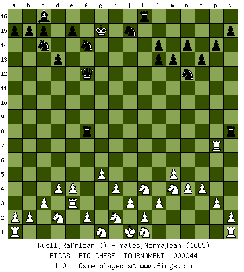 Last move : 1-0 2009 October 14 21:6:16 [Event "FICGS__BIG_CHESS__TOURNAMENT__000044"] [Site "FICGS"] [Date "2009.05.25"] [Round "1"] [White "Rusli,Rafnizar"] [Black "Yates,Normajean"] [Result "1-0"] [WhiteElo ""] [BlackElo "1685"] 1.g2-g4 j15-h13 2.e2-e4 h16-l13 3.l2-l3 l13-o10 4.h1-f3 h15-g13 5.o2-o3 l15-l13 6.d2-d4 k16-l14 7.c1-l9 g16-f14 8.c2-c3 m15-m13 9.m2-m4 l16-p12 10.n2-n4 n15-n14 11.l1-p5 d15-d13 12.o1-d11 j16-j15 13.l9-g13 h14-g13 14.p5-g13 j15-h16 15.f3-f11 c16-g12 16.f11-f9 g15-g14 17.h3-h4 b16-c14 18.f9-e9 p16-o14 19.f1-b5 o16-n15 20.b5-l14 k15-l14 21.e9-l15 n15-m14 22.l15-f15 g12-f13 23.d11-f13 g14-f13 24.f15-g14 p12-n10 25.g14-f13 m16-m15 26.f13-b9 a16-b16 27.b9-a10 f16-n9 28.a10-h10 n9-l7 29.h10-g10 q16-l16 30.p1-n2 e16-g16 31.g10-k10 g16-g15 32.g4-g5 m15-k15 33.k10-p5 l7-k8 34.b1-d2 m14-k16 35.g13-m8 o10-m12 36.n2-p3 k16-f12 37.m4-m5 o14-n12 38.m1-m4 k8-o4 39.p5-q4 h16-h15 40.p3-n2 o4-n5 41.m4-j4 b16-k16 42.j2-k4 g15-g7 43.o3-o4 g7-q7 44.q4-p5 n5-l7 45.m8-g13 f12-g13 46.p5-g13 n10-l8 47.g13-b8 l8-c16 48.b8-p8 q7-q8 49.p8-j14 h15-g15 50.j4-j7 k15-j15 51.j14-j15 h13-j15 52.j7-l7 k16-k8 53.e1-e3 l16-k16 54.e3-f3 k8-f8 55.f3-e3 o15-o13 56.n2-m4 m12-f12 57.l7-p7 p15-p14 58.p2-p3 1-0 This big chess game has been lost on time (started : 2009.05.25 10:34:49) Follow this game move after move (download)Chess is a sea in which a gnat may drink and an elephant may bathe. (Hindu proverb) Im Leben werden Partien nie so unstrittig gewonnen wie im Spiel (Emanuel Lasker) El Ajedrez es un terrible juego. Si no controlas el centro, tu oponente tiene una posición mas holgada. Si tienes control del centro, ¡entonces realmente tu tienes algo de que preocuparte!. (Siegbert Tarrasch) Un footballeur joue avec ses pieds, parfois avec sa tête. Un joueur d'échecs ne joue qu'avec sa tête. Et quand il ne joue plus, il meurt. (Jacob Murray) Perhaps chess is the wrong game for the times (The Chess Master and the Computer, by Garry Kasparov - 2010)