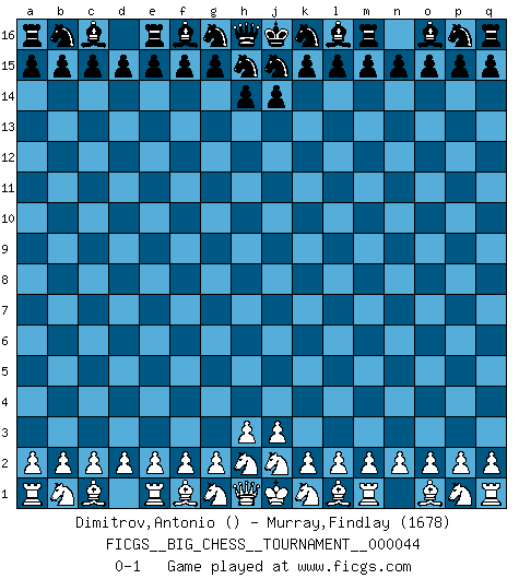 Last move : 0-1 2009 June 24 20:43:1 [Event "FICGS__BIG_CHESS__TOURNAMENT__000044"] [Site "FICGS"] [Date "2009.05.25"] [Round "1"] [White "Dimitrov,Antonio"] [Black "Murray,Findlay"] [Result "0-1"] [WhiteElo ""] [BlackElo "1678"] 0-1 This big chess game has been lost on time (started : 2009.05.25 10:34:49) Follow this game move after move (download)There are tough players and nice guys, and I'm a tough player. (Bobby Fischer) Jeder leidlich begabte Spieler, er braucht keineswegs hervorragend veranlagt zu sein, kann es zum Meister bringen. Aber das ist ja auch gar nicht nötig! Der richtige Standpunkt ist es, zu seinem Vergnügen zu spielen, und man glaube ja nicht, dass der Genuss proportional dem Können sei. (Siegbert Tarrasch) Coloca el contenido de las piezas del Ajedrez en un sombrero, agitalo vigorosamente, arrojalas en un tablero desde una altura de 30 centimetros y así obtendras el estilo de Steinitz. (H. E. Bird) Les échecs, c'est l'imagination. (David Bronstein) The problem with troubleshooting is that trouble shoots back. (Anonymous)