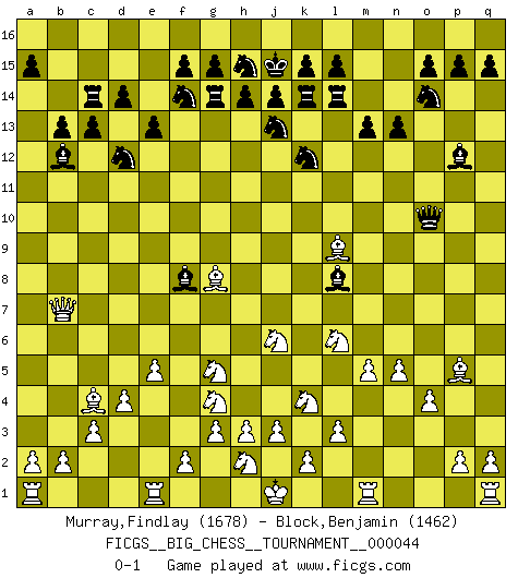 Last move : 0-1 2009 August 8 0:38:56 [Event "FICGS__BIG_CHESS__TOURNAMENT__000044"] [Site "FICGS"] [Date "2009.05.25"] [Round "1"] [White "Murray,Findlay"] [Black "Block,Benjamin"] [Result "0-1"] [WhiteElo "1678"] [BlackElo "1462"] 1.j2-k4 j15-h13 2.h2-g4 h16-o10 3.o2-o3 m15-m13 4.n2-n4 l16-p12 5.k1-h2 n15-n13 6.m2-m4 o16-f8 7.g1-j2 m16-m14 8.c2-c3 m14-k14 9.l2-l3 e15-e13 10.d2-d4 e16-e14 11.e2-e4 e14-g14 12.f1-c4 p16-o14 13.o1-g8 q16-m16 14.l1-p5 b16-c14 15.c1-l9 f16-b12 16.p1-n2 d15-d14 17.k4-j6 c16-l8 18.j2-k4 m16-m14 19.b1-d2 h13-k12 20.m4-m5 m14-l14 21.n2-m4 h15-j13 22.m4-l6 g16-f14 23.d2-f3 k16-h15 24.f3-g5 c14-d12 25.e4-e5 j16-j15 26.g2-g3 c15-c13 27.h1-b7 a16-c16 28.o3-o4 c16-c14 29.n4-n5 b15-b13 0-1 This big chess game has been lost on time (started : 2009.05.25 10:34:49) Follow this game move after move (download)The isolated Pawn casts gloom over the entire chessboard. (Aaron Nimzovich) Ich hatte Angst gegen einen russischen Großmeister zu verlieren, und er befürchtete gegen einen kleinen Jungen zu verlieren. (über ein Remis gegen Juri Awerbach). (Robert James Fischer) El Ajedrez es realmente noventa y nueve por ciento calculación. (Soltis) Si le désir cupide (et stupide) de gagner est une inépuisable source de souffrance, une combinaison brillante sur l'échiquier est une découverte : le coquelicot qui s'épanouit lorsque apparaît la Voie Lactée. (Arrabal) The various flowers seem good to different people. (Chinese proverb)