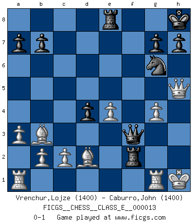Last move : 0-1 2006 October 11 9:37:24 [Event "FICGS__CHESS__CLASS_E__000013"] [Site "FICGS"] [Date "2006.09.13"] [Round "1"] [White "Vrenchur,Lojze"] [Black "Caburro,John"] [Result "0-1"] [WhiteElo "1400"] [BlackElo "1400"] 1.e4 c6 2.Bc4 d5 3.exd5 cxd5 4.Bb3 Nf6 5.Nf3 Nc6 6.O-O Bf5 7.Ba4 Bg4 8.h3 Bxf3 9.Qxf3 e6 10.Re1 Be7 11.Nc3 O-O 12.a3 Rc8 13.Qg3 Bd6 14.Qh4 d4 15.Ne4 Nxe4 16.Qxe4 Qa5 17.Bb3 Qc7 18.d3 Kh8 19.Bd2 f5 20.Qh4 e5 21.g4 fxg4 22.hxg4 Ne7 23.Be6 Ng6 24.Qh5 Rce8 25.Bb3 e4 26.dxe4 Bg3 27.fxg3 Qxg3+ 28.Kh1 Rf2 29.Rg1 Qf3+ 0-1 Caro-Kann : Hillbilly attack Kingside Castling by player White (move 6) Kingside Castling by player Black (move 11) Player Black won this chess game. Follow this game move after move (download)Dazzling combinations are for the many, shifting wood is for the few. (Georg Kieninger) Auf Remis zu spielen ist gewissermaßen ein Verbrechen gegen das Schachspiel. (Mikhail Nekhemyevich Tal) Solo puedes ser bueno en el Ajedrez si amas al juego. (Bobby Fischer) Horreur, mais aussi harmonie suprême : qu'y avait-il en effet au monde en dehors des échecs ? Le brouillard, l'inconnu, le non-être... (Vladimir Nabokov) It's unlucky to be superstitious. (Dave Enteles)