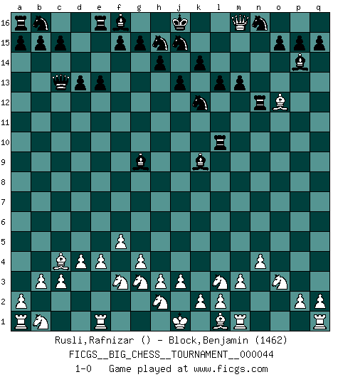 Last move : 1-0 2009 June 20 11:58:22 [Event "FICGS__BIG_CHESS__TOURNAMENT__000044"] [Site "FICGS"] [Date "2009.05.25"] [Round "1"] [White "Rusli,Rafnizar"] [Black "Block,Benjamin"] [Result "1-0"] [WhiteElo ""] [BlackElo "1462"] 1.g2-g4 j15-h13 2.f2-f4 h16-o10 3.g1-f3 o10-o2 4.p1-o3 o2-c13 5.c2-c3 m15-m13 6.n2-n3 n15-n13 7.e2-e4 l16-o13 8.j2-g3 d15-d13 9.d2-d4 m16-m14 10.b2-b3 c16-k9 11.f4-f5 m14-l14 12.k1-l3 o16-e7 13.h1-o7 e7-g9 14.o1-f9 l14-l13 15.o7-o10 e15-e13 16.n3-n4 k16-l14 17.o10-p11 o13-p14 18.f9-l14 l13-l14 19.p11-n13 p16-o14 20.f1-c4 h13-k12 21.c1-m10 q16-n16 22.n13-k10 j14-j13 23.m2-m3 l14-l10 24.k10-m12 l15-l13 25.m12-o12 k15-k14 26.m10-k8 n16-n12 27.o12-l15 g16-j15 28.k8-o12 o14-n16 29.l15-m16 1-0 Follow this game move after move (download)My opponents make good moves too. Sometimes I don't take these things into consideration. (Bobby Fischer) Es ist im Leben wie im Schachspiel. Wir entwerfen einen Plan, dieser bleibt jedoch bedingt durch das, was im Schachspiel dem Gegner, im Leben dem Schicksal zu tun belieben wird. (Arthur Schopenhauer) El juego de Damas es para vagabundos. (Paul Morphy) Avec des compensations pour le matériel en plus... (Anonyme) To be champion requires more than simply being a strong player; one has to be a strong human being as well. (Anatoly Karpov)