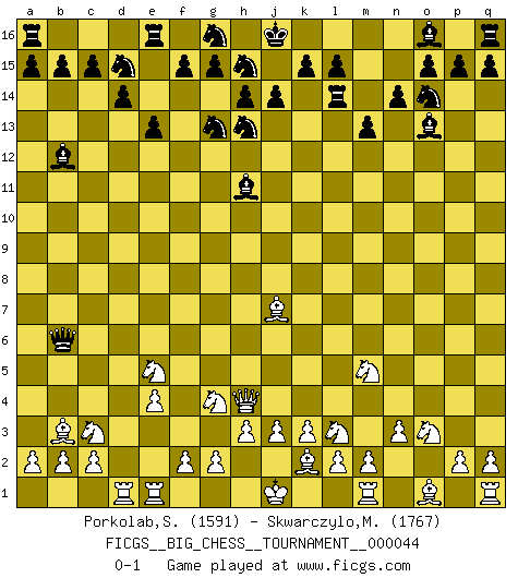 Last move : 0-1 2009 August 23 21:20:13 [Event "FICGS__BIG_CHESS__TOURNAMENT__000044"] [Site "FICGS"] [Date "2009.05.25"] [Round "1"] [White "Porkolab,Sandor"] [Black "Skwarczylo,Marek"] [Result "0-1"] [WhiteElo "1591"] [BlackElo "1767"] 1.j2-k4 m15-m13 2.b1-c3 h15-g13 3.e2-e4 j15-h13 4.d2-d4 h16-o10 5.h2-g4 o10-o2 6.p1-o3 o2-d12 7.g1-f3 l16-o13 8.h1-o7 n15-n14 9.n2-n3 e15-e13 10.f1-c4 f16-b12 11.k4-m5 d15-d14 12.c4-b3 p16-o14 13.c1-j7 d12-a9 14.f3-e5 a9-a7 15.o7-n7 a7-d4 16.a1-d1 d4-b6 17.n7-l7 m16-m14 18.k1-l3 m14-l14 19.l7-h4 k16-h15 20.k2-k3 c16-h11 21.l1-k2 b16-d15 0-1 This big chess game has been lost on time (started : 2009.05.25 10:34:49) Follow this game move after move (download)The chessboard is the world, the pieces are the phenomena of the Universe, the rules of the game are what we call the laws of Nature and the player on the other side is hidden from us. (Thomas Huxley) Kasparov stellt für gewöhnlich die Regeln auf und bricht sie dann selbst wieder. (Alexej Shirov) La captura del Rey enemigo es la finalidad pero no el primer objetivo de la partida. (William Steinitz) Le jeu d'échecs est comme rejeté hors du temps. (Antoine de Saint-Exupéry) Either move or be moved. (Ezra Pound)