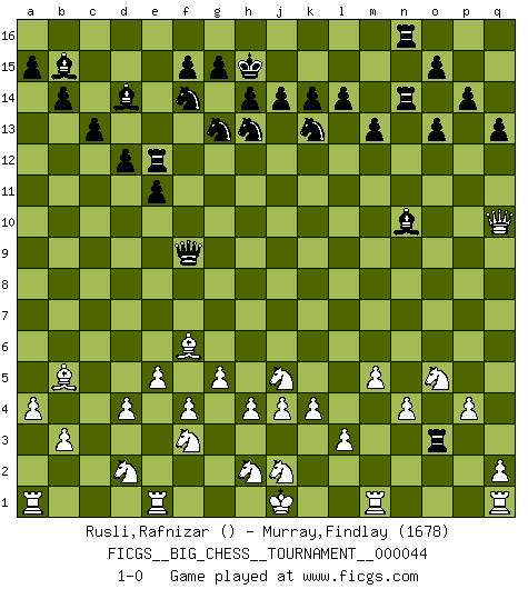 Last move : 1-0 2009 August 18 8:55:42 [Event "FICGS__BIG_CHESS__TOURNAMENT__000044"] [Site "FICGS"] [Date "2009.05.25"] [Round "1"] [White "Rusli,Rafnizar"] [Black "Murray,Findlay"] [Result "1-0"] [WhiteElo ""] [BlackElo "1678"] 1.g2-g4 j15-k13 2.f2-f4 h15-g13 3.e2-e4 c15-c13 4.d2-d4 b15-b14 5.k2-k4 c16-b15 6.o2-o3 d15-d13 7.n2-n4 d13-d12 8.o1-d11 k16-h15 9.g1-f3 p15-p14 10.e4-e5 o16-p15 11.l2-l3 h16-p9 12.p2-p4 p9-d9 13.d11-h15 j16-h15 14.j3-j4 m15-m13 15.m2-m4 l16-p12 16.p1-n2 p15-q14 17.l1-f6 p16-o14 18.k1-j3 m16-m14 19.f1-c4 m14-n14 20.b2-b3 q16-m16 21.g4-g5 e15-e13 22.a2-a4 e13-e12 23.c1-a3 k15-k14 24.b1-d2 f16-d14 25.j2-h4 e12-e11 26.h1-l4 b16-d15 27.c4-b5 g16-j15 28.l4-p8 n14-n9 29.f6-o14 p12-n10 30.p8-q8 q14-n11 31.q8-n11 n15-o14 32.n11-o10 o14-o13 33.a3-n15 m16-n16 34.n15-o14 n16-n14 35.o14-f6 n9-o9 36.o10-q10 q15-q13 37.m1-o1 d9-c8 38.j3-g4 c8-c2 39.b5-c4 c2-h7 40.n2-p3 l15-l14 41.q10-q8 j15-h13 42.m4-m5 d15-f14 43.q8-q10 h7-m3 44.h4-j2 o9-o3 45.o1-m1 m3-h7 46.h3-h4 e16-e12 47.p3-o5 a16-n16 48.g4-j5 h7-f9 49.c4-b5 1-0 Follow this game move after move (download)Chess is like war on a board. (Bobby Fischer) Ich verstehe Aljechins Kombinationen ganz gut; aber woher er diese Angriffschancen bekommt und wie er die Eröffnung behandelt das ist für mich ein Buch mit sieben Siegeln. (Rudolf Spielmann) Realmente no sabemos como el juego fue inventado, aunque hay sospechas. Tan pronto como descubramos a los culpables, se los haremos saber. (Bruce Pandolfini) Demandez au pauvre Cg1 ce qu'il en pense. Eduard Gufeld à propos de la variante Saemisch de l'Est-Indienne. The difference between stupidity and genius is that genius has its limits. (Murphy)