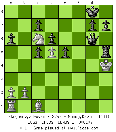 Last move : 0-1 2009 June 7 19:32:50 [Event "FICGS__CHESS__CLASS_E__000107"] [Site "FICGS"] [Date "2009.05.25"] [Round "1"] [White "Stoyanov,Zdravko"] [Black "Moody,David"] [Result "0-1"] [WhiteElo "1275"] [BlackElo "1441"] 1.e4 e5 2.Nf3 Nc6 3.Bb5 a6 4.Bxc6 bxc6 5.h3 d6 6.d3 f5 7.exf5 Bxf5 8.O-O Nf6 9.Re1 Be7 10.Nbd2 O-O 11.Nh4 Qd7 12.Qf3 Nd5 13.c4 Bxh4 14.cxd5 Bg6 15.Qe2 Bxf2+ 16.Kh1 Bxe1 17.Qxe1 Bxd3 18.Qe3 Bf5 19.Qb3 c5 20.Nc4 Be4 21.Na5 Rf3 22.gxf3 Qxh3+ 23.Kg1 Bxf3 24.Qc2 Qh1+ 25.Kf2 Qg2+ 26.Ke3 Qxc2 27.Kxf3 Rf8+ 28.Kg3 Qg6+ 29.Kh4 Rf5 30.Nc6 Rh5+ 0-1 Ruy Lopez : Exchange variation Kingside Castling by player White (move 8) Kingside Castling by player Black (move 10) Player Black won this chess game. Follow this game move after move (download)Strategy requires thought, tactics require observation. (Max Euwe) Glücklicherweise sind Großmeister Ruben Fines reine Schachbücher weniger phallozentrisch [als seine Schachpsychologie] und deswegen auch weniger lächerlich. (Nigel Short) Si yo gano un torneo, yo lo gano por mí mismo. Yo hago las jugadas. Nadie me ayuda. (Bobby Fischer) Donnez-moi un Cavalier en 6e et je gagnerais toutes mes parties. (Steinitz) It is not true that people stop pursuing dreams because they grow old, they grow old because they stop pursuing dreams. (Gabriel Garcia Marquez)