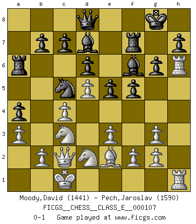 Last move : 0-1 2009 August 31 3:30:46 [Event "FICGS__CHESS__CLASS_E__000107"] [Site "FICGS"] [Date "2009.05.25"] [Round "1"] [White "Moody,David"] [Black "Pech,Jaroslav"] [Result "0-1"] [WhiteElo "1441"] [BlackElo "1590"] 1.d4 Nf6 2.Nf3 g6 3.Bf4 Bg7 4.e3 O-O 5.Be2 d6 6.Nbd2 Nc6 7.c4 Nh5 8.Bg3 Nxg3 9.hxg3 a5 10.a3 e5 11.d5 Nb8 12.Ne4 Na6 13.Nfd2 f5 14.Nc3 Bd7 15.Qc2 Nc5 16.O-O-O a4 17.Rh4 Bf6 18.Rh6 Ra6 19.Rdh1 Rf7 0-1 King's Indian : London system Kingside Castling by player Black (move 4) Queenside Castling by player White (move 16) Player Black won this chess game. Follow this game move after move (download)Could we look into the head of a Chess player, we should see there a whole world of feelings, images, ideas, emotion and passion. (Alfred Binet) Die unerbitterlichsten Regeln im Schach sind die Ausnahmen. (Savielly Grigorievitsch Tartakower) La maestría del Ajedrez consiste esencialmente en analizar posiciónes de Ajedrez con precisión. (Mikhail Botvinnik) Même si l'adversaire joue le coup analysé précédemment, recommencez l'analyse en voyant la nouvelle position. Première règle de Blumenfeld When it is a question of money, everybody is of the same religion. (Voltaire)