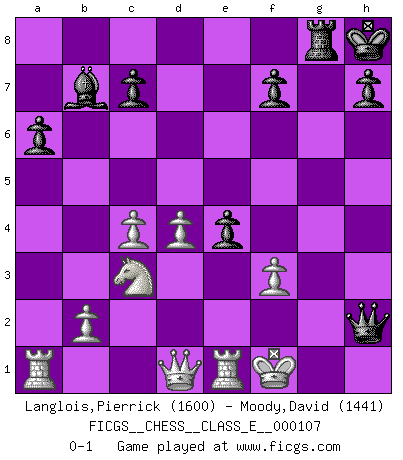 Last move : 0-1 2009 June 30 8:35:9 [Event "FICGS__CHESS__CLASS_E__000107"] [Site "FICGS"] [Date "2009.05.25"] [Round "1"] [White "Langlois,Pierrick"] [Black "Moody,David"] [Result "0-1"] [WhiteElo "1600"] [BlackElo "1441"] 1.Nf3 Nc6 2.e4 e5 3.Bb5 a6 4.Ba4 Nf6 5.O-O Be7 6.Re1 b5 7.Bb3 O-O 8.c3 d5 9.d4 dxe4 10.Nxe5 Bb7 11.Ng4 Na5 12.Bh6 Nxb3 13.axb3 gxh6 14.Nxh6+ Kh8 15.Nf5 Rg8 16.c4 Qd7 17.Nxe7 Qxe7 18.Nc3 bxc4 19.bxc4 Ng4 20.f3 Nxh2 21.Kxh2 Qh4+ 22.Kg1 Rxg2+ 23.Kxg2 Rg8+ 24.Kf1 Qh2 0-1 Reti Opening Kingside Castling by player White (move 5) Kingside Castling by player Black (move 7) Player Black won this chess game. Follow this game move after move (download)Chess is a more highly symbolic game, but the aggressions are therefore even more frankly represented in the play. It probably began as a war game; that is, the representation of a miniature battle between the forces of two kingdoms. (Karl Meninger) Kostenjuk hat keinen Sexappeal. (Loek van Wely) Bobby Fischer es el jugador de Ajedrez mas grande que jamás haya existido. (Ken Smith) Les échecs sont plus proches de l'art de l'assassinat que de l'art de la guerre. (Arturo Perez-Reverte) I live to kill Traxler counterattack. (Ilmars Cirulis)