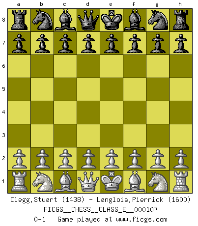 Last move : 0-1 2009 July 4 21:47:31 [Event "FICGS__CHESS__CLASS_E__000107"] [Site "FICGS"] [Date "2009.05.25"] [Round "1"] [White "Clegg,Stuart"] [Black "Langlois,Pierrick"] [Result "0-1"] [WhiteElo "1438"] [BlackElo "1600"] 0-1 This chess game has been lost on time (started : 2009.05.25 17:45:22) Player Black won this chess game. Follow this game move after move (download)When you absolutely don't know what to do anymore, it is time to panic. (John van der Wiel) Schach ist das schnellste Spiel der Welt, weil man in jeder Sekunde Tausende von Gedanken ordnen muß. (Albert Einstein) Solo puedes ser bueno en el Ajedrez si amas al juego. (Bobby Fischer) Horreur, mais aussi harmonie suprême : qu'y avait-il en effet au monde en dehors des échecs ? Le brouillard, l'inconnu, le non-être... (Vladimir Nabokov) Employ the attack like tactic of defense. (Chinese proverb)