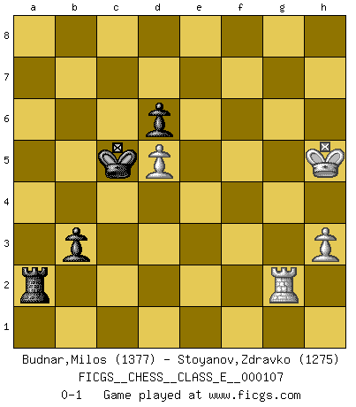 Last move : 0-1 2009 June 30 17:21:43 [Event "FICGS__CHESS__CLASS_E__000107"] [Site "FICGS"] [Date "2009.05.25"] [Round "1"] [White "Budnar,Milos"] [Black "Stoyanov,Zdravko"] [Result "0-1"] [WhiteElo "1377"] [BlackElo "1275"] 1.e4 c5 2.Nc3 Nc6 3.Bb5 Ne5 4.Nf3 c4 5.Nxe5 Qc7 6.Nxf7 Kxf7 7.Qf3+ Ke8 8.Qh5+ g6 9.Qd5 Nf6 10.Qxc4 Qxc4 11.Bxc4 a6 12.O-O b5 13.Bd5 Nxd5 14.Nxd5 Ra7 15.d3 Bg7 16.c3 e6 17.Be3 Rb7 18.Nb6 Kd8 19.Nxc8 Kxc8 20.d4 e5 21.d5 d6 22.Rfc1 h6 23.b4 g5 24.g4 h5 25.f3 hxg4 26.fxg4 Rh4 27.Rc2 Rxg4+ 28.Rg2 Rxe4 29.Bxg5 Rc4 30.Bd2 e4 31.Re1 Bxc3 32.Bxc3 Rxc3 33.Rxe4 Rd3 34.Rg8+ Kc7 35.Re7+ Kb6 36.Rxb7 Kxb7 37.Rg5 Rd1+ 38.Kg2 Rd2+ 39.Kh3 Rxa2 40.Rg7+ Kc8 41.Rg2 Ra4 42.Rg4 Kc7 43.Kh4 Kb6 44.h3 a5 45.bxa5 Rxa5 46.Kh5 Kc5 47.Rg5 b4 48.Rg4 b3 49.Rg2 Ra2 0-1 Sicilian : Closed, 2...Nc6 Kingside Castling by player White (move 12) 10 pieces endgame at move 39 : White KRPPP , Black KRPPP WHITE : King + 1 Rook 3 Pawns BLACK : King + 1 Rook 3 Pawns 9 pieces endgame at move 45 : White KRPPP , Black KRPP WHITE : King + 1 Rook 3 Pawns BLACK : King + 1 Rook 2 Pawns 8 pieces endgame at move 45 : White KRPP , Black KRPP WHITE : King + 1 Rook 2 Pawns BLACK : King + 1 Rook 2 Pawns Player Black won this chess game. Follow this game move after move (download)Chess is a matter of delicate judgment, knowing when to punch and how to duck. (Bobby Fischer) Ich verlor meine Bürgerrechte, mein Gehalt wurde mir nicht mehr bezahlt und ich wurde zensiert und durfte nicht mehr ins Ausland reisen. [nach dem Match Fischer-Taimanov 6:0] (Mark Taimanov) Realmente no sabemos como el juego fue inventado, aunque hay sospechas. Tan pronto como descubramos a los culpables, se los haremos saber. (Bruce Pandolfini) La vie est comme un jeu d'échecs : nous esquissons un plan, mais celui-ci est tributaire de ce que daignent faire l'adversaire aux échecs et le destin dans la vie. (Arthur Schopenhauer) If you don't practice you don't deserve to win. (Andre Agassi)