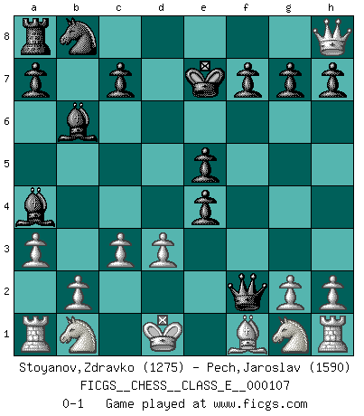 Last move : 0-1 2009 August 15 20:12:36 [Event "FICGS__CHESS__CLASS_E__000107"] [Site "FICGS"] [Date "2009.05.25"] [Round "1"] [White "Stoyanov,Zdravko"] [Black "Pech,Jaroslav"] [Result "0-1"] [WhiteElo "1275"] [BlackElo "1590"] 1.e4 Nf6 2.d3 e5 3.a3 d5 4.c3 dxe4 5.Qa4+ Bd7 6.Qb3 Bc5 7.Qxb7 Bb6 8.Bg5 Bc6 9.Bxf6 Qxf6 10.Qc8+ Ke7 11.Qxh8 Qxf2+ 12.Kd1 Ba4+ 0-1 Alekhine's defense : Maroczy variation Player Black won this chess game. Follow this game move after move (download)I'm not afraid of Spassky. The world knows I'm the best. You don't need a match to prove it. (Bobby Fischer) Ich möchte Schüler heranbilden, die das Vermögen haben, selbst zu denken und Kritik zu üben. (Emanuel Lasker) Ciertamente, de todas la drogas del mundo, el Ajedrez debe ser el mas placentero permamentemente. (Assiac) Aidez vos pièces, elles vous aideront. (Paul Morphy) Perfection is achieved, not when there is nothing more to add, but when there is nothing left to take away. (Antoine de Saint-Exupéry)