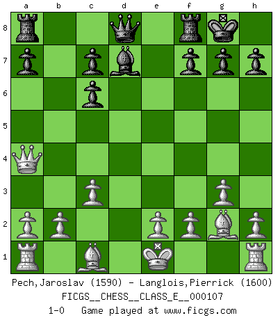 Last move : 1-0 2009 October 14 21:6:16 [Event "FICGS__CHESS__CLASS_E__000107"] [Site "FICGS"] [Date "2009.05.25"] [Round "1"] [White "Pech,Jaroslav"] [Black "Langlois,Pierrick"] [Result "1-0"] [WhiteElo "1590"] [BlackElo "1600"] 1.c4 Nf6 2.Nc3 e5 3.Nf3 Nc6 4.g3 d5 5.cxd5 e4 6.dxc6 bxc6 7.Ng5 Be7 8.Qa4 O-O 9.Ngxe4 Bd7 10.Nxf6+ Bxf6 11.Bg2 Bxc3 12.dxc3 1-0 English Opening Kingside Castling by player Black (move 8) Player White won this chess game. Follow this game move after move (download)I'm not afraid of Spassky. The world knows I'm the best. You don't need a match to prove it. (Bobby Fischer) Ich weiss nicht was Gott gegen mich auf 1.e4 antworten würde. (Robert James Fischer) El Ajedrez es el gimnasio de la mente. (Blaise Pascal) Il n'y a pas de prix trop élevé au scalp de l'ennemi. (Koblentz) Creativity is allowing yourself to make mistakes. Art is knowing which ones to keep. (Scott Adams)