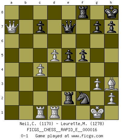 Last move : 0-1 2009 June 19 15:59:27 [Event "FICGS__CHESS__RAPID_E__000016"] [Site "FICGS"] [Date "2009.05.28"] [Round "1"] [White "Neil,Charlie"] [Black "Leurette,Marc-Antoine"] [Result "0-1"] [WhiteElo "1170"] [BlackElo "1278"] 1.c4 e5 2.Nc3 Nf6 3.g3 d5 4.cxd5 Nxd5 5.Bg2 Be6 6.d3 Bb4 7.Bd2 Nc6 8.Nf3 O-O 9.O-O f6 10.Rc1 Nxc3 11.Bxc3 Bxc3 12.bxc3 Ne7 13.Nd2 Nf5 14.Bxb7 Rb8 15.Bg2 Bxa2 16.Qa4 Rb2 17.Nc4 Bxc4 18.Qxc4+ Kh8 19.Bh3 Nd6 20.Qg4 f5 21.Qa4 Rxe2 22.Qxa7 Qe7 23.d4 Ne4 24.d5 Nd2 25.Rfd1 Ne4 26.c4 Nxf2 0-1 English : Bremen, reverse Dragon Kingside Castling by player Black (move 8) Kingside Castling by player White (move 9) Player Black won this chess game. Follow this game move after move (download)You may learn much more from a game you lose than from a game you win. You will have to lose hundreds of games before becoming a good player. (Jose Raul Capablanca) Der Bart als Geschlechtszeichen mitten im Gesicht ist obszön. Daher gefällt er den Weibern. [Zugegeben, kein Schachzitat, aber unglaublich originell] (Arthur Schopenhauer) El Ajedrez es una hermosa aventura. (Bent Larsen) Lorsque vous vous retrouvez devant une position atroce, ne tendez pas un ultime piège dérisoire avec l'intention d'abandonner si l'adversaire le déjoue ! Faites-vous plutôt un devoir de résister comme si votre vie en dépendait. Jouez le coup qui vous déplairait au centuple si vous étiez dans la peau de votre tortionnaire ! The only thing that overcomes hard luck is hard work. (Harry Golden)