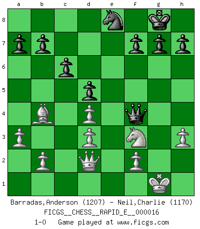 Last move : 1-0 2009 June 16 15:57:4 [Event "FICGS__CHESS__RAPID_E__000016"] [Site "FICGS"] [Date "2009.05.28"] [Round "1"] [White "Barradas,Anderson"] [Black "Neil,Charlie"] [Result "1-0"] [WhiteElo "1207"] [BlackElo "1170"] 1.e4 e6 2.d4 d5 3.exd5 exd5 4.Nc3 Bb4 5.Bd2 Nf6 6.a3 Bxc3 7.Bxc3 O-O 8.Nf3 Re8+ 9.Be2 Bg4 10.O-O Nbd7 11.h3 Bf5 12.Bd3 Bxd3 13.cxd3 c6 14.Re1 Qc7 15.Qd2 Rxe1+ 16.Rxe1 Nf8 17.Bb4 Ne6 18.Qc3 Re8 19.Ba5 Qd6 20.Bb4 Qf4 21.Re2 Ng5 22.Rxe8+ Nxe8 23.Qd2 Nxh3+ 24.gxh3 1-0 French : Exchange variation Kingside Castling by player Black (move 7) Kingside Castling by player White (move 10) Player White won this chess game. Follow this game move after move (download)By this measure (on the gap between Fischer & his contemporaries), I consider him the greatest world champion. (Garry Kasparov) Ohne Leiden bildet sich kein Charakter. (Ernst Freiherr von Feuchtersleben) El Ajedrez hace al hombre ser mas sabio y ver mas claro. (Vladimir Putin) Je crois qu'il existe des manières très spécifiques de jouer efficacement contre une machine. Evidemment, nous n'avons aucune chance en technique pure, parce que l'ordinateur calcule de manière parfaite. Mais lorsque nous faisons appel à notre cerveau, en utilisant l'intuition et la compréhension, alors nous restons beaucoup plus forts. (Anatoli Karpov) He who laughs last probably does not get the joke. (Unknown)