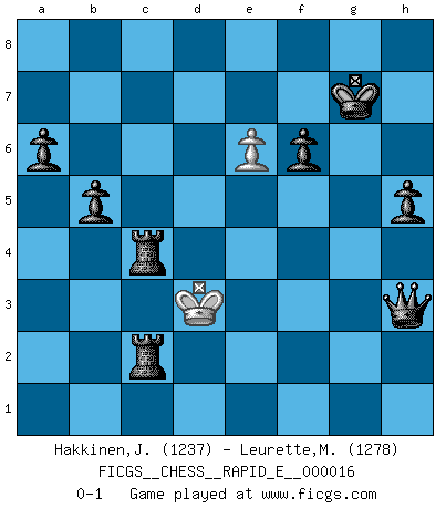 Last move : 0-1 2009 June 26 9:51:19 [Event "FICGS__CHESS__RAPID_E__000016"] [Site "FICGS"] [Date "2009.05.28"] [Round "1"] [White "Hakkinen,Jorma"] [Black "Leurette,Marc-Antoine"] [Result "0-1"] [WhiteElo "1237"] [BlackElo "1278"] 1.d4 d5 2.c4 e6 3.a3 c6 4.Nf3 Nf6 5.Bg5 dxc4 6.e4 h6 7.Bh4 g5 8.Bg3 Nxe4 9.Bxb8 Rxb8 10.Bxc4 b5 11.Bd3 Nf6 12.O-O Bg7 13.Nc3 a6 14.Ne5 Bb7 15.Ne4 Qxd4 16.Nxf6+ Bxf6 17.Nf3 Qxb2 18.Re1 Qxa1 19.Qxa1 Bxa1 20.Rxa1 c5 21.Ne5 Rc8 22.Be2 O-O 23.h3 c4 24.Rc1 c3 25.Nd7 Rfd8 26.Ne5 Kg7 27.Nf3 Be4 28.Ne5 f6 29.Nf3 Bd3 30.Bxd3 Rxd3 31.Kh2 c2 32.Ne1 Rd2 33.f3 Re2 34.Nd3 Rc3 35.Nb2 Rxa3 36.Kg3 Rb3 37.Nd1 Rb1 38.Rxc2 Rxc2 39.Ne3 Re2 40.Ng4 R1b2 41.h4 Rxg2+ 42.Kh3 h5 43.Ne3 Rh2+ 44.Kg3 gxh4+ 45.Kf4 Rb4+ 46.Nc4 Rxc4+ 47.Ke3 h3 48.f4 Rhc2 49.Kd3 h2 50.f5 h1Q 51.fxe6 Qh3+ 0-1 Queen's gambit declined Kingside Castling by player White (move 12) Kingside Castling by player Black (move 22) Promotion Queen by player Black (move 50) 10 pieces endgame at move 51 : White KP , Black KQRRPPPP WHITE : King + 1 Pawn BLACK : King + 1 Queen 2 Rooks 4 Pawns Player Black won this chess game. Follow this game move after move (download)Robert Fischer is a law unto himself. (Larry Evans) Glücklicherweise sind Großmeister Ruben Fines reine Schachbücher weniger phallozentrisch [als seine Schachpsychologie] und deswegen auch weniger lächerlich. (Nigel Short) Los Peones son nacidos libres, y aún así, se encuentran encadenados por todos lados. (Rick Kennedy) Shah mat. Le roi est mort. Cri de fierté d'un joueur venant de terrasser son adversaire, courtoisement, sans effusion de sang. May the force be with you. (Han Solo in Star Wars ep.4)