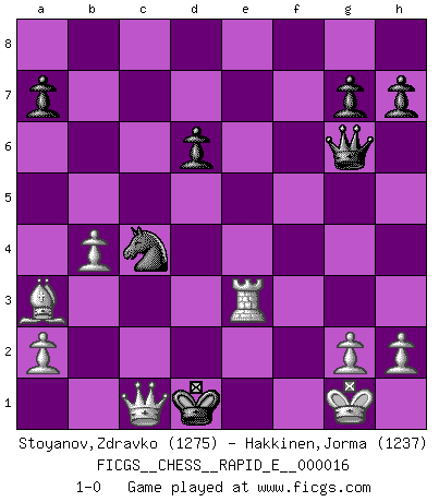 Last move : 1-0 2009 July 3 16:30:44 [Event "FICGS__CHESS__RAPID_E__000016"] [Site "FICGS"] [Date "2009.05.28"] [Round "1"] [White "Stoyanov,Zdravko"] [Black "Hakkinen,Jorma"] [Result "1-0"] [WhiteElo "1275"] [BlackElo "1237"] 1.e4 e5 2.Nf3 f5 3.exf5 e4 4.Nd4 Qf6 5.c3 d5 6.Be2 Bxf5 7.Nxf5 Qxf5 8.O-O Nd7 9.f3 Bc5+ 10.Kh1 O-O-O 11.fxe4 Qxe4 12.Bf3 Qd3 13.b4 Bd6 14.Na3 Ngf6 15.Re1 Rde8 16.Bb2 Rxe1+ 17.Qxe1 Re8 18.Qd1 Ne5 19.Be2 Qg6 20.Nb5 Nfg4 21.Bxg4+ Nxg4 22.Nxd6+ cxd6 23.Qf3 Ne5 24.Qxd5 Nd3 25.Ba3 Re1+ 26.Rxe1 Nf2+ 27.Kg1 Ng4 28.Qg8+ Kc7 29.Re7+ Kc6 30.Qc8+ Kd5 31.Qxb7+ Kc4 32.Qc6+ Kd3 33.Qd5+ Kc2 34.Re2 Ne5 35.Qb3+ Kd3 36.Re3+ Kxd2 37.c4 Nxc4 38.Qc3+ Kd1 39.Qc1+ 1-0 Latvian counter-gambit Kingside Castling by player White (move 8) Queenside Castling by player Black (move 10) Player White won this chess game. Follow this game move after move (download)We cannot resist the fascination of sacrifice, since a passion for sacrifices is part of a Chessplayer's nature. (Rudolf Spielman) Schach ist das schnellste Spiel der Welt, weil man in jeder Sekunde Tausende von Gedanken ordnen muß. (Albert Einstein) Un jugador que trata de regresar una movida en el Ajedrez es un futuro carterista. (Richard Fenton) Le pion, dans sa simplicité, marche droit devant lui, mais lorsqu'il prend, il le fait obliquement? Ainsi l'homme, tant qu'il reste pauvre, marche dans la droiture et vit honnêtement, mais lorsqu'il recherche les honneurs, il flatte, se parjure et, par les voies obliques, cherche une position supérieure sur l'échiquier du monde. (Jean de Galles) I take risks, sometimes patients die, but not taking risks causes more patients to die. So I guess my biggest problem is I've been cursed with the ability to do the math. (Gregory House, House M.D.)