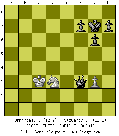 Last move : 0-1 2009 June 4 19:32:11 [Event "FICGS__CHESS__RAPID_E__000016"] [Site "FICGS"] [Date "2009.05.28"] [Round "1"] [White "Barradas,Anderson"] [Black "Stoyanov,Zdravko"] [Result "0-1"] [WhiteElo "1207"] [BlackElo "1275"] 1.e4 c5 2.Nf3 Nc6 3.d4 e6 4.dxc5 Bxc5 5.c3 Qb6 6.Qe2 Nf6 7.a3 Ng4 8.Nd4 Nge5 9.Qe3 Nc4 10.Bxc4 Nxd4 11.cxd4 Bxd4 12.Qf3 Bxb2 13.Bxb2 Qxb2 14.Qc3 Qxc3+ 15.Nxc3 O-O 16.O-O b6 17.f4 Bb7 18.Bb5 Rfd8 19.Rad1 d6 20.f5 exf5 21.Rxf5 a6 22.Bc4 Rd7 23.Rdf1 Rf8 24.Nd5 b5 25.Nb6 Re7 26.Bd5 Bxd5 27.Nxd5 Rxe4 28.Nc3 Re3 29.Rc1 g6 30.Rf6 Rc8 31.Na2 Rxc1+ 32.Nxc1 Rxa3 33.Rxd6 Ra1 34.Rd8+ Kg7 35.Rc8 b4 36.Kf2 a5 37.Ke2 a4 38.Kd2 b3 39.Rb8 Rb1 40.Rb4 b2 41.Nd3 a3 42.Kc2 Rg1 43.g3 a2 44.Kxb2 a1Q+ 45.Kc2 Rg2+ 46.Kb3 Qb1+ 47.Kc4 Rc2+ 48.Kb5 Qf1 49.Rb3 Rxh2 50.Kc4 Rc2+ 51.Rc3 Rxc3+ 52.Kxc3 Qf3 0-1 Sicilian defense Kingside Castling by player Black (move 15) Kingside Castling by player White (move 16) Promotion Queen by player Black (move 44) 10 pieces endgame at move 49 : White KRNP , Black KQRPPP WHITE : King + 1 Rook 1 Knight 1 Pawn BLACK : King + 1 Queen 1 Rook 3 Pawns 9 pieces endgame at move 51 : White KNP , Black KQRPPP WHITE : King + 1 Knight 1 Pawn BLACK : King + 1 Queen 1 Rook 3 Pawns 8 pieces endgame at move 52 : White KNP , Black KQPPP WHITE : King + 1 Knight 1 Pawn BLACK : King + 1 Queen 3 Pawns Player Black won this chess game. Follow this game move after move (download)It is no time to be playing Chess when the house is on fire. (Italian Proverb) Charakterschwächen offenbaren sich normalerweise während einer Schachpartie. (Garry Kasparov) No hay precio que sea tan grande por la cabellera del Rey enemigo. (Koblentz) Le génie consiste à savoir transgresser les règles au moment opportun. (Teichmann) Lottery : A tax on people who are bad at math. (Author unknown)