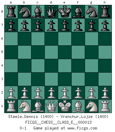 Last move : 0-1 2006 October 23 19:32:38 [Event "FICGS__CHESS__CLASS_E__000013"] [Site "FICGS"] [Date "2006.09.13"] [Round "1"] [White "Steele,Dennis"] [Black "Vrenchur,Lojze"] [Result "0-1"] [WhiteElo "1400"] [BlackElo "1400"] 0-1 This chess game has been lost on time (started : 2006.09.13 14:12:9) Player Black won this chess game. Follow this game move after move (download)When you are lonely, when you feel yourself an alien in the world, play Chess. This will raise your spirits and be your counselor in war. (Aristotle) Im Schach nämlich geht es darum, daß Ich des Gegners klein zu kriegen, sein Ego zu zerbrechen und zu zermahlen, seine Selbstachtung zu zertreten und zu verscharren und seine ganze mißachtenswerte sogenannte Persönlichkeit ein für alle Mal tot zu hacken und zu zerstampfen und dadurch die menschliche Gesellschaft von einer stinkenden Pestbeule zu befreien. Es ist ein königliches Spiel. (Robert James Fischer) Por tratar de evitar la pérdida de una pieza, muchas personas han perdido una partida de Ajedrez. (Savielly Tartakover) On peut tirer plus d'utilité d'une partie perdue que de 100 parties gagnées. (Capablanca) Humor is by far the most significant activity of the human brain. (Edward De Bono)