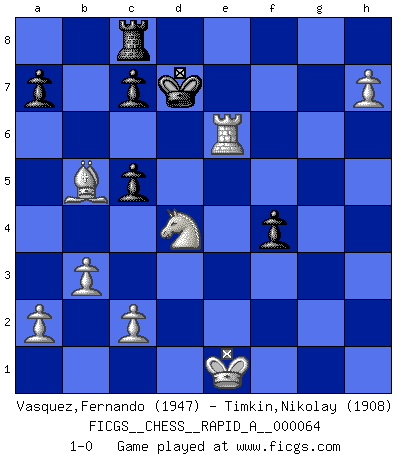 Last move : 1-0 2009 October 7 14:1:10 [Event "FICGS__CHESS__RAPID_A__000064"] [Site "FICGS"] [Date "2009.05.28"] [Round "1"] [White "Vasquez,Fernando"] [Black "Timkin,Nikolay"] [Result "1-0"] [WhiteElo "1947"] [BlackElo "1908"] 1.e4 e5 2.Nf3 Nc6 3.d4 exd4 4.Nxd4 Bc5 5.Nxc6 Qf6 6.Qf3 Qxf3 7.gxf3 bxc6 8.Nc3 Ne7 9.Rg1 O-O 10.Be3 Bxe3 11.fxe3 d6 12.Kf2 Rb8 13.b3 g6 14.f4 Kg7 15.Rd1 f6 16.Bc4 Bd7 17.h4 Nc8 18.h5 Nb6 19.Bd3 Kf7 20.Rh1 g5 21.h6 Ke7 22.Rdg1 Rbe8 23.Ke1 gxf4 24.exf4 Rg8 25.Ne2 Kf7 26.e5 f5 27.Rxg8 Rxg8 28.Rh5 dxe5 29.Bxf5 exf4 30.Bxh7 Re8 31.Rg5 Kf6 32.Rg6+ Kf5 33.Rg7 Ke5 34.Bg6 Rf8 35.h7 Be6 36.Bd3 Nd5 37.Rg5+ Kd6 38.Nd4 Nf6 39.Rg6 c5 40.Rxf6 Rc8 41.Rxe6+ Kd7 42.Bb5+ 1-0 Scotch game Kingside Castling by player Black (move 9) Player White won this chess game. Follow this game move after move (download)When asked, -How is that you pick better moves than your opponents?, I responded: I'm very glad you asked me that, because, as it happens, there is a very simple answer. I think up my own moves, and I make my opponent think up his. (Alexander Alekhine) Es ist schade, dass viele Schachsportler vergessen, wie wichtig Auftreten und angemessene Kleidung sind. (Alexandra Kosteniuk) El sobresalir en el Ajedrez es un signo de una mente intrigante. (Sir Arthur Conan Doyle) Il vaut mieux sacrifier les pièces de l'adversaire. (Xavier Tartacover) I would love to change the world, but they won't give me the source code. (Unknown)