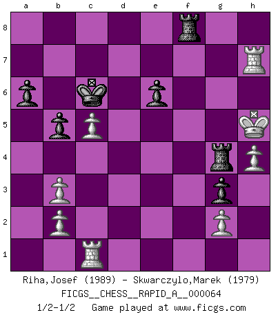 Last move : 1/2-1/2 2009 June 24 11:30:59 [Event "FICGS__CHESS__RAPID_A__000064"] [Site "FICGS"] [Date "2009.05.28"] [Round "1"] [White "Riha,Josef"] [Black "Skwarczylo,Marek"] [Result "1/2-1/2"] [WhiteElo "1989"] [BlackElo "1979"] 1.Nf3 d5 2.d4 Bf5 3.c4 e6 4.Nc3 c6 5.Qb3 Qb6 6.c5 Qxb3 7.axb3 Nf6 8.Bf4 Na6 9.e3 Nb4 10.Ra4 Nd3+ 11.Bxd3 Bxd3 12.Ne5 Bb5 13.Nxb5 cxb5 14.Ra5 a6 15.Ke2 Nh5 16.Kf3 g5 17.Bxg5 f6 18.Kg4 Rg8 19.Nf3 fxg5 20.Kxh5 g4 21.Ne5 Be7 22.h4 O-O-O 23.f3 g3 24.c6 Bb4 25.R5a1 Rdf8 26.e4 Rf6 27.Nd7 Rf4 28.Nc5 Bxc5 29.dxc5 dxe4 30.fxe4 Rg6 31.cxb7+ Kxb7 32.Raf1 Rxe4 33.Rf7+ Kc6 34.Rxh7 Rg8 35.Rc1 Rf8 36.Kg6 Rg4+ 37.Kh5 1/2-1/2 Reti Opening Queenside Castling by player Black (move 22) This chess game ended in a draw. Follow this game move after move (download)Chess is a forcing house where the fruits of character can ripen more fully than in life. (Edward Morgan Foster) Das ganze Leben mit einer Ehefrau ist wie ein Endspiel mit ungleichfarbigen Läufern. (Viktor Kortschnoi) Dios mío, Bobby Fischer juega tan simple. (Alexei Suetin) Roi des jeux et jeu des rois, les échecs portent en eux un sentiment d'infini. Ils donnent à celui qui s'est efforcé d'en approfondir les arcanes l'impression de n'être pas à la mesure de l'homme; en fait, ils constituent un résumé de l'univers, un microcosme, et figurent cette grande échelle qui, dans les plans de la lumière descend jusqu'à la matière, qui des abîmes insondables remonte jusqu'en l'infini de Dieu. (Pyrame) Everything in life is luck. (Donald Trump)