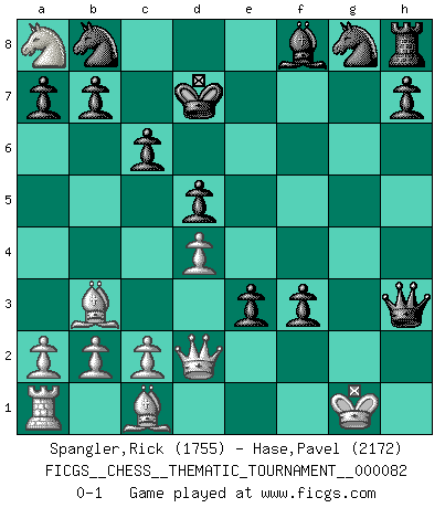 Last move : 0-1 2009 July 17 15:36:53 [Event "FICGS__CHESS__THEMATIC_TOURNAMENT__000082"] [Site "FICGS"] [Date "2009.05.30"] [Round "1"] [White "Spangler,Rick"] [Black "Hase,Pavel"] [Result "0-1"] [WhiteElo "1755"] [BlackElo "2172"] 1.e4 e5 2.f4 exf4 3.Nf3 d6 4.d4 g5 5.h4 g4 6.Ng5 f6 7.Nh3 gxh3 8.gxh3 Qe7 9.Bc4 f5 10.Nc3 Qxh4+ 11.Kf1 fxe4 12.Nd5 Bxh3+ 13.Rxh3 Qxh3+ 14.Ke1 Qg3+ 15.Kf1 f3 16.Qd2 c6 17.Nc7+ Kd7 18.Nxa8 d5 19.Bb3 Qh3+ 20.Kg1 e3 0-1 KGA : Fischer defense Player Black won this chess game. Follow this game move after move (download)You have to have the fighting spirit. You have to force moves and take chances. (Bobby Fischer) Kombinieren und Schwarzhandel gehören verboten. (Savielly Grigorievitsch Tartakower) ¡Examina movidas que hagan daño! Un buen ojo for movidas desvastantes es mucho mas importante que el conocimiento de principios estratégicos. (Purdy) Botvinnik disait en comparant les échecs à la musique: Il existe une science dont le but est l'étude de l'acoustique et des sons. Mais il y a aussi un art qui se sert de l'océan des sons : c'est la musique. De toute évidence, il en est de même pour la pensée. La logique est l'étude des lois de la réflexion et les échecs reflètent, en tant qu'art, le côté logique de la réflexion, sous la forme d'images artistiques... Extrait de Fischer - Spassky, Reykjavik 1972 par Alexander & F. Wyndham (Ed. Solar), p 37. It is a good thing for an uneducated man to read books of quotations. (Winston Churchill)