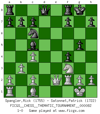 Last move : 1-0 2009 October 18 9:25:34 [Event "FICGS__CHESS__THEMATIC_TOURNAMENT__000082"] [Site "FICGS"] [Date "2009.05.30"] [Round "1"] [White "Spangler,Rick"] [Black "Satonnet,Patrick"] [Result "1-0"] [WhiteElo "1755"] [BlackElo "1722"] 1.e4 e5 2.f4 exf4 3.Bc4 Nf6 4.d3 d5 5.exd5 Nxd5 6.Qe2+ Be6 7.Nf3 Be7 8.O-O g5 9.Qe5 O-O 10.Nbd2 Nc6 11.Qe2 Ne3 12.Rf2 Nxc4 13.Nxc4 Bxc4 14.dxc4 Bc5 15.b3 1-0 This chess game has been lost on time (started : 2009.05.30 18:54:17) KGA : Bishop's gambit, Cozio (Morphy) defense Kingside Castling by player White (move 8) Kingside Castling by player Black (move 9) Player White won this chess game. Follow this game move after move (download)When I asked Fischer why he had not played a certain move in our game, he replied: 'Well, you laughed when I wrote it down !' (Mikhail Tal) Ich spiele ehrlich und spiele, um zu gewinnen. Wenn ich verliere nehme ich meine Medizin. (Robert James Fischer) Los asuntos humanos son como una partida de Ajedrez: solo aquellos que no lo toman seriamente, pueden ser llamados buenos jugadores. (Hung Tzu Ch'eng) A chaque perte on perd un peu de soi. (Joël Lautier) Without deviation from the norm, progress is not possible. (Frank Zappa)