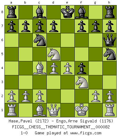 Last move : 1-0 2009 July 15 10:51:14 [Event "FICGS__CHESS__THEMATIC_TOURNAMENT__000082"] [Site "FICGS"] [Date "2009.05.30"] [Round "1"] [White "Hase,Pavel"] [Black "Engo,Arne Sigvald"] [Result "1-0"] [WhiteElo "2172"] [BlackElo "1176"] 1.e4 e5 2.f4 exf4 3.Bc4 Qh4+ 4.Kf1 Nc6 5.d4 Nf6 6.Nf3 Qh6 7.Nc3 Nh5 8.Nd5 1-0 This chess game has been lost on time (started : 2009.05.30 18:54:17) KGA : Bishop's gambit, Boden defense Player White won this chess game. Follow this game move after move (download)If your opponent cannot do anything active, then don't rush the position; instead you should let him sit there, suffer, and beg you for a draw. (Jeremy Silman) Die Elozahlen sind sehr schlecht für das Schach. Jetzt ist Schach eine Sportindustrie, die darauf zielt Elopunkte zu machen. (Miguel Najdorf) El estómago es una parte esencial del maestro de Ajedrez. (Bent Larsen) Tous ces prétendus hommes politiques sont les pions, les Cavaliers, les Tours ou les Fous d'une partie d'échecs qui se jouera tant qu'un hasard ne renversera pas l'échiquier. (Honoré de Balzac) It is not true that people stop pursuing dreams because they grow old, they grow old because they stop pursuing dreams. (Gabriel Garcia Marquez)