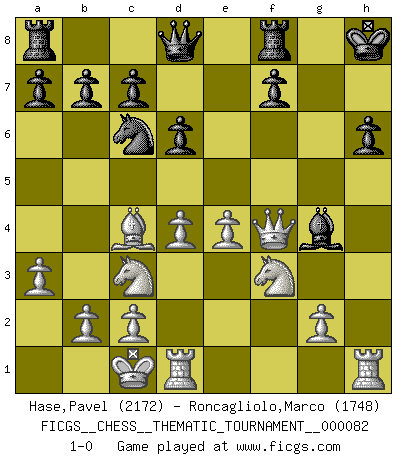 Last move : 1-0 2009 September 6 22:16:42 [Event "FICGS__CHESS__THEMATIC_TOURNAMENT__000082"] [Site "FICGS"] [Date "2009.05.30"] [Round "1"] [White "Hase,Pavel"] [Black "Roncagliolo,Marco"] [Result "1-0"] [WhiteElo "2172"] [BlackElo "1748"] 1.e4 e5 2.f4 exf4 3.Bc4 Nf6 4.Nc3 d6 5.d4 Be7 6.Bxf4 O-O 7.Nf3 Bg4 8.Qd3 Nc6 9.a3 h6 10.O-O-O Nh5 11.Be3 Kh8 12.Qd2 g5 13.h4 Nf4 14.hxg5 Bxg5 15.Bxf4 Bxf4 16.Qxf4 1-0 KGA : Bishop's gambit, Bogolyubov variation Kingside Castling by player Black (move 6) Queenside Castling by player White (move 10) Player White won this chess game. Follow this game move after move (download)My God, Bobby Fischer plays so simply. (Alexei Suetin) Um dein Spiel zu verbessern musst du zuallererst das Endspiel studieren, denn diese kann unabhängig studiert werden. Die Eröffnung und das Mittelspiel müssen immer in Bezug gesetzt werden zum Endspiel. (José Raúl Capablanca) Ciertamente el estado mental actual de Bobby Fischer es una tragedia. Uno de los mas grandes jugadores de Ajedrez del mundo -el orgullo y pena del Ajedrez Americano. (Frank Brady) La tactique est l'élément le plus important du milieu de jeu. (Siegbert Tarrasch) A person who never made a mistake never tried anything new. (Albert Einstein)