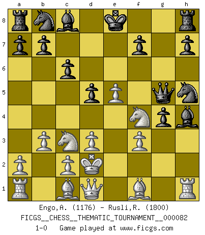 Last move : 1-0 2009 August 23 12:26:59 [Event "FICGS__CHESS__THEMATIC_TOURNAMENT__000082"] [Site "FICGS"] [Date "2009.05.30"] [Round "1"] [White "Engo,Arne Sigvald"] [Black "Rusli,Rafnizar"] [Result "1-0"] [WhiteElo "1176"] [BlackElo "1800"] 1.e4 e5 2.f4 exf4 3.Nf3 g5 4.h4 g4 5.Nd4 d5 6.Nc3 Nf6 7.e5 Nh5 8.d3 Be7 9.Nde2 Bxh4+ 10.Kd2 c6 11.b3 f3 12.gxf3 Qg5+ 13.Nf4 1-0 King's knight's gambit Player White won this chess game. Follow this game move after move (download)Chess is the gymnasium of the mind. (Blaise Pascal) Vom Schach wurde gesagt das Leben sei dafür nicht lange genug. Aber das ist der Fehler des Lebens, nicht des Schach'. (Irving Chernev) Una buena ofensiva y una buena defensa, comienzan ambas con un buen desarrollo. (Bruce A. Moon) La solitude du joueur d'Echecs à l'approche du mat est semblable à celle du condamné. (Francis Szpiner) Wawaweewa ! (Borat: Cultural learnings of America for make benefit glorious nation of Kazakhstan)