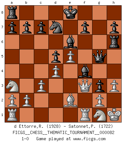 Last move : 1-0 2009 October 10 20:44:36 [Event "FICGS__CHESS__THEMATIC_TOURNAMENT__000082"] [Site "FICGS"] [Date "2009.05.30"] [Round "1"] [White "d Ettorre,Rodolfo"] [Black "Satonnet,Patrick"] [Result "1-0"] [WhiteElo "1928"] [BlackElo "1722"] 1.e4 e5 2.f4 exf4 3.Nf3 Nf6 4.e5 Nh5 5.Be2 d5 6.d4 Rg8 7.O-O g5 8.c3 Be6 9.Qc2 Rg6 10.Na3 g4 11.Ne1 Nd7 12.Bxf4 Nxf4 13.Rxf4 Bh6 14.Rf1 g3 15.Kh1 Be3 16.Nf3 Rh6 17.h3 Qe7 18.Qd3 Bf4 19.Ng1 Qg5 20.Qf3 1-0 This chess game has been lost on time (started : 2009.05.30 18:54:17) KGA : Schallop defense Kingside Castling by player White (move 7) Player White won this chess game. Follow this game move after move (download)If cunning alone were needed to excel, women would be the best Chess players. (Albin) Ich verstehe Aljechins Kombinationen ganz gut; aber woher er diese Angriffschancen bekommt und wie er die Eröffnung behandelt das ist für mich ein Buch mit sieben Siegeln. (Rudolf Spielmann) Solo los afeminados hacen el Enroque. (Rob Sillars) Il n'y a pas de prix trop élevé au scalp de l'ennemi. (Koblentz) Good decisions come from experience, and experience comes from bad decisions. (Anonymous)