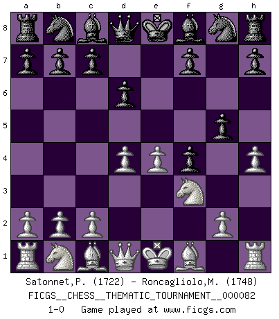 Last move : 1-0 2009 August 9 12:49:22 [Event "FICGS__CHESS__THEMATIC_TOURNAMENT__000082"] [Site "FICGS"] [Date "2009.05.30"] [Round "1"] [White "Satonnet,Patrick"] [Black "Roncagliolo,Marco"] [Result "1-0"] [WhiteElo "1722"] [BlackElo "1748"] 1.e4 e5 2.f4 exf4 3.Nf3 d6 4.d4 g5 5.h4 1-0 This chess game has been lost on time (started : 2009.05.30 18:54:17) KGA : Fischer defense Player White won this chess game. Follow this game move after move (download)It is difficult to play against Einstein's theory --on his first loss to Fischer. (Mikhail Tal) Ich verachte Kasparow. (Viktor Kortschnoi) Cuando no sepas que mover, espera por una idea que se le venga a la la cabeza de tu oponente. Tenlo por seguro de que esa idea estará incorrecta. (Siegbert Tarrasch) Les sacrifices démontrent seulement que quelqu'un a gaffé. (Savielly Tartacover) It's unlucky to be superstitious. (Dave Enteles)