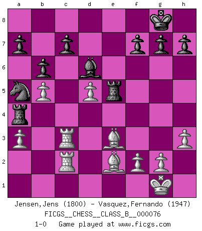 Last move : 1-0 2009 November 7 20:20:0 [Event "FICGS__CHESS__CLASS_B__000076"] [Site "FICGS"] [Date "2009.06.01"] [Round "1"] [White "Jensen,Jens"] [Black "Vasquez,Fernando"] [Result "1-0"] [WhiteElo "1800"] [BlackElo "1947"] 1.e4 e5 2.Nf3 Nf6 3.Nxe5 d6 4.Nf3 Nxe4 5.d4 d5 6.Bd3 Be7 7.O-O Nc6 8.c4 Nb4 9.Be2 O-O 10.Nc3 Bf5 11.a3 Nxc3 12.bxc3 Nc6 13.Re1 Re8 14.cxd5 Qxd5 15.Bf4 Bd6 16.c4 Qe4 17.Be3 Rad8 18.h3 Qc2 19.d5 Na5 20.Qxc2 Bxc2 21.Nd4 Ba4 22.Rac1 b6 23.Nb5 Bxb5 24.cxb5 Re4 25.Rc3 Rde8 26.Rec1 R8e7 27.R1c2 Ra4 28.Ra2 Re5 29.Rac2 1-0 This chess game has been lost on time (started : 2009.06.01 9:20:28) Petrov : Classical attack Kingside Castling by player White (move 7) Kingside Castling by player Black (move 9) Player White won this chess game. Follow this game move after move (download)We must make sure that Chess will not be like a dead language, very interesting, but for a very small group. (Sytze Faber) Eine Person mit durchschnittlichem IQ kann etwa eine ELO von 2000 erreichen. (Jonathan Levitt) Ayuda a tus piezas para que ellas te puedan ayudar. (Paul Morphy) Il n'y a pas eu de défaite parce que je ne crois pas que cet ordinateur ait jamais existé. IBM a triché en refusant d'imprimer les modes de recherche de la machine. C'est évident, pendant le match, des coups décisifs ont été joués par des êtres humains. Aujourd'hui, les meilleurs spécialistes en informatique ne peuvent toujours pas expliquer comment Deep-Blue a pu jouer contre la logique des ordinateurs. IBM a gagné une guerre de communication, mais ils sont incapables de prouver que l'ordinateur a gagné tout seul. (Garry Kasparov) The greatest con, that he ever pulled... was making you believe... that he is you. (Revolver, movie)