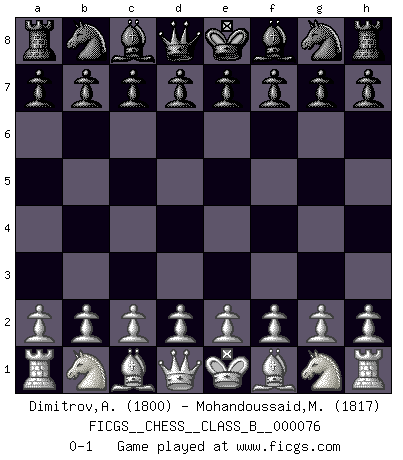 Last move : 0-1 2009 July 11 10:17:5 [Event "FICGS__CHESS__CLASS_B__000076"] [Site "FICGS"] [Date "2009.06.01"] [Round "1"] [White "Dimitrov,Antonio"] [Black "Mohandoussaid,Malik"] [Result "0-1"] [WhiteElo "1800"] [BlackElo "1817"] 0-1 This chess game has been lost on time (started : 2009.06.01 9:20:28) Player Black won this chess game. Follow this game move after move (download)Chess is a beautiful mistress. (Bent Larsen) Ein Kibitz ist einer, der deinem Gegner gute Ratschläge gibt. (Andrew Soltis) Nunca nadie ha ganado una partida de Ajedrez rindiendose. (Unknown) Mon pion favori sur ma case favorite ! Bronstein en parlant d'un coup de pion en h5 quand il avait les Noirs. To send light into the darkness of men's hearts - such is the duty of the artist. (Schumann)