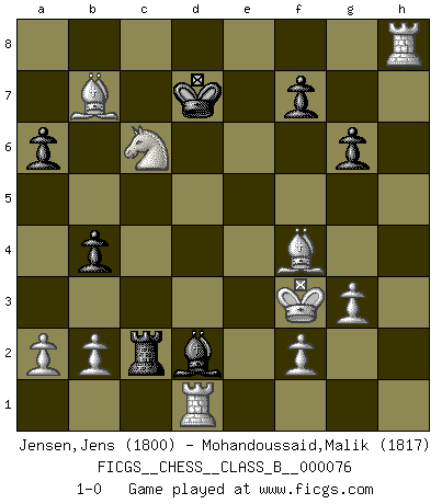 Last move : 1-0 2009 November 16 17:14:32 [Event "FICGS__CHESS__CLASS_B__000076"] [Site "FICGS"] [Date "2009.06.01"] [Round "1"] [White "Jensen,Jens"] [Black "Mohandoussaid,Malik"] [Result "1-0"] [WhiteElo "1800"] [BlackElo "1817"] 1.e4 c5 2.Nf3 Nc6 3.d4 cxd4 4.Nxd4 d6 5.Nc3 e5 6.Ndb5 a6 7.Na3 Nf6 8.Be3 b5 9.Nd5 Nxe4 10.Bb6 Qh4 11.Nc7+ Kd7 12.Nxa8 Be7 13.g3 Nxg3 14.hxg3 Qe4+ 15.Qe2 Qxe2+ 16.Kxe2 Bb7 17.Bh3+ Ke8 18.Nc7+ Kf8 19.Bg2 g6 20.Nd5 Bg5 21.Rad1 Kg7 22.c4 b4 23.Nc2 Ne7 24.Bc7 Rc8 25.Bxd6 Rxc4 26.Nce3 Bxe3 27.Bxe5+ Kg8 28.Nxe7+ Kf8 29.Bxb7 Bg5 30.Nc6 Rc2+ 31.Kf3 Ke8 32.Rxh7 Bd2 33.Rh8+ Kd7 34.Bf4 1-0 Sicilian defense Player White won this chess game. Follow this game move after move (download)I have never in my life played the French Defence, which is the dullest of all openings. (Wilhelm Steinitz) Jeder leidlich begabte Spieler, er braucht keineswegs hervorragend veranlagt zu sein, kann es zum Meister bringen. Aber das ist ja auch gar nicht nötig! Der richtige Standpunkt ist es, zu seinem Vergnügen zu spielen, und man glaube ja nicht, dass der Genuss proportional dem Können sei. (Siegbert Tarrasch) El Ajedrez, como cualquier actividad creativa, solo puede existir a través del esfuerzo combinado de aquellos que tienen talento creativo y de aquellos que poseen la habilidad de organizar su trabajo creativo. (Mikhail Botvinnik) J'ai toujours senti une vague pitié pour l'homme qui ne connaît rien aux échecs, tout comme j'en aurais pour un homme ignorant de l'amour. Les Echecs, comme la musique ou comme l'amour, ont le pouvoir de rendre heureux. (Siegbert Tarrasch) Winning isn't everything... but losing is nothing. (Mednis)