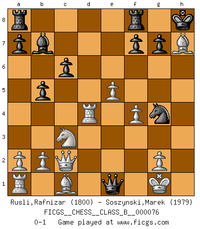 Last move : 0-1 2009 June 11 20:15:15 [Event "FICGS__CHESS__CLASS_B__000076"] [Site "FICGS"] [Date "2009.06.01"] [Round "1"] [White "Rusli,Rafnizar"] [Black "Soszynski,Marek"] [Result "0-1"] [WhiteElo "1800"] [BlackElo "1979"] 1.d4 d5 2.c4 e6 3.Nf3 Nf6 4.Nc3 c6 5.e3 Nbd7 6.Qc2 Bd6 7.Bd3 dxc4 8.Bxc4 b5 9.Bd3 Bb7 10.O-O O-O 11.e4 e5 12.dxe5 Nxe5 13.Nxe5 Bxe5 14.f4 Bd4+ 15.Kh1 Ng4 16.e5 Nxh2 17.Bxh7+ Kh8 18.Rd1 Ng4 19.Rxd4 Qh4+ 20.Kg1 Qe1+ 0-1 Queen's gambit declined Kingside Castling by player White (move 10) Kingside Castling by player Black (move 10) Player Black won this chess game. Follow this game move after move (download)When your house is on fire, you can't be bothered with the neighbors. Or, as we say in Chess, if your King is under attack you don't worry about losing a Pawn on the Queen's side. (Gary Kasparov) Je mehr ich von der FIDE weiss, um so weniger verstehe ich. (Alexander Kalifman) Mi estilo es algo parecido entre un poco de Tal y Petrosian. (Reshevsky) Pour moi, les échecs ne sont pas un jeu mais un art. (Alexandre Alekhine) The man who strikes first admits that his ideas have given out. (Chinese proverb)