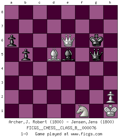 Last move : 1-0 2010 March 21 21:27:36 [Event "FICGS__CHESS__CLASS_B__000076"] [Site "FICGS"] [Date "2009.06.01"] [Round "1"] [White "Archer,J. Robert"] [Black "Jensen,Jens"] [Result "1-0"] [WhiteElo "1800"] [BlackElo "1800"] 1.d4 Nf6 2.c4 e6 3.Nf3 d5 4.g3 Be7 5.Bg2 c6 6.Qc2 O-O 7.O-O Nbd7 8.Nbd2 b6 9.e4 Bb7 10.e5 Ne8 11.cxd5 cxd5 12.Re1 Rc8 13.Qa4 a6 14.Nf1 b5 15.Qb3 Qb6 16.Qd3 h6 17.g4 f6 18.exf6 Nexf6 19.g5 Ne4 20.gxh6 Rf7 21.Be3 gxh6 22.Rac1 Rcf8 23.Ne5 Nxe5 24.dxe5 Qd8 25.Bxh6 Bg5 26.Rxe4 Bxh6 27.Rg4+ Rg7 28.Rxg7+ Bxg7 29.Qg6 Qe8 30.Qg4 Qf7 31.Ng3 Qxf2+ 32.Kh1 Qxb2 33.Qxe6+ Kh7 34.Qh3+ Kg8 35.Rc7 Ba8 36.Rc8 Qxa2 37.Qe6+ Kh8 38.Qf5 Kg8 39.Nf1 Rxc8 40.Qxc8+ Kh7 41.Qxa8 Bxe5 42.Bxd5 Qf2 43.Qg8+ Kh6 44.Qe6+ Qf6 45.Qh3+ Kg6 46.Qg4+ Qg5 47.Qe6+ 1-0 Queen's pawn game Kingside Castling by player Black (move 6) Kingside Castling by player White (move 7) 10 pieces endgame at move 42 : White KQBNP , Black KQBPP WHITE : King + 1 Queen 1 Bishop 1 Knight 1 Pawn BLACK : King + 1 Queen 1 Bishop 2 Pawns Player White won this chess game. Follow this game move after move (download)Morphy was probably the greatest genius of them all. (Bobby Fischer) Wie gewinnt Tal? Er entwickelt alle seine Figuren in die Brettmitte und opfert sie dann irgendwo. (Robert James Fischer) No es suficiente ser un buen jugador, se debe también de jugar bién. (Siegbert Tarrasch) Le jeu d'échecs fait naître et fortifie en nous plusieurs qualités précieuses dans le cours de l'existence, telles que la prévoyance, la circonspection, la prudence, et la persévérance. (Benjamin Franklin - 1783, la morale des échecs) Perhaps chess is the wrong game for the times (The Chess Master and the Computer, by Garry Kasparov - 2010)