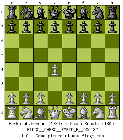 Last move : 1-0 2009 July 1 21:19:2 [Event "FICGS__CHESS__RAPID_B__000122"] [Site "FICGS"] [Date "2009.06.01"] [Round "1"] [White "Porkolab,Sandor"] [Black "Sousa,Renato"] [Result "1-0"] [WhiteElo "1783"] [BlackElo "1800"] 1.d4 1-0 This chess game has been lost on time (started : 2009.06.01 10:42:1) Queen's pawn Player White won this chess game. Follow this game move after move (download)A win by an unsound combination, however showy, fills me with artistic horror. (Wilhelm Steinitz) Sehr viele beherrschen heutzutage das große Einmalseins des Schachspiels und kennen sogar dessen Logarithmentafeln auswendig - deshalb sollte man hin und wieder zu beweisen trachten, dass zwei mal zwei auch fünf sein kann. (Mikhail Nekhemyevich Tal) Tu eres para mi la Reina en d8 y yo soy el Peón en d7!!. (GM Eduard Gufeld) A ce moment-là, je menaçais de comprendre la position ! (Clément L'Heureux) Programming can only do so much before it becomes too much. (Don Groves)