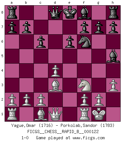 Last move : 1-0 2009 August 15 8:35:23 [Event "FICGS__CHESS__RAPID_B__000122"] [Site "FICGS"] [Date "2009.06.01"] [Round "1"] [White "Yague,Omar"] [Black "Porkolab,Sandor"] [Result "1-0"] [WhiteElo "1716"] [BlackElo "1783"] 1.Nf3 Nf6 2.d4 d5 3.e3 c6 4.Bd3 Bg4 5.Nbd2 e6 6.O-O Nbd7 7.h3 Bh5 8.e4 dxe4 9.Nxe4 Nxe4 10.Bxe4 Nf6 11.Bd3 1-0 This chess game has been lost on time (started : 2009.06.01 10:42:1) Reti Opening Kingside Castling by player White (move 6) Player White won this chess game. Follow this game move after move (download)A Chess game is divided into three stages: the first, when you hope you have the advantage, the second when you believe you have an advantage, and the third... when you know you're going to lose ! (Savielly Tartakower) Konzentriere dich auf materielle Gewinne. Nimm, was dir dein Gegner gibt, ausser es gibt einen guten Grund der dagegenspricht. (Robert James Fischer) Estaba muy claro de que el punto vulnerable del Gran Maestro Americano (Bobby Fischer) radicaba en las posiciones de doble filo, colgantes, irracionales, donde el siempre falló en encontrar un triunfo aún en una posición de clara victoria. (Efim Geller) Pour se monter efficace, un Cavalier a besoin d'avant-postes ! Les Cavaliers font les meilleurs bloqueurs de pions passés. It's not enough to succeed. Others must fail. (Gore Vidal)