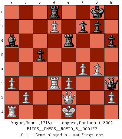 Last move : 0-1 2009 July 23 20:9:14 [Event "FICGS__CHESS__RAPID_B__000122"] [Site "FICGS"] [Date "2009.06.01"] [Round "1"] [White "Yague,Omar"] [Black "Langaro,Caetano"] [Result "0-1"] [WhiteElo "1716"] [BlackElo "1800"] 1.d4 d5 2.e3 Nf6 3.Be2 Nbd7 4.Nf3 e6 5.O-O Bd6 6.c4 c6 7.Nc3 O-O 8.Qc2 dxc4 9.Bxc4 b5 10.Bd3 Bb7 11.a3 a5 12.Bd2 Qe7 13.Rfc1 Rfc8 14.Ng5 h6 15.Nge4 Nxe4 16.Nxe4 c5 17.Nxd6 Qxd6 18.Bxa5 Rxa5 19.Qd2 R5a8 20.Bxb5 e5 21.d5 Nf6 22.Bc4 Rd8 23.Rd1 e4 24.Qc2 Ng4 25.g3 Qg6 26.d6 Ne5 27.f4 Nd3 28.Bxd3 exd3 29.Qxd3 Qe6 30.Qe2 Qe4 31.Kf2 Ra6 32.d7 Re6 33.g4 Qg2+ 34.Ke1 Qh3 35.Rd3 Ba6 0-1 Queen's pawn game Kingside Castling by player White (move 5) Kingside Castling by player Black (move 7) Player Black won this chess game. Follow this game move after move (download)I don't believe in psychology. I believe in good moves. (Bobby Fischer) Immer nach dem besten Zug zu suchen ist ziemlich unpraktisch. (Nigel Short) El Ajedrez tiene tanto misterio como las mujeres. (Purdy) Seul un grand joueur sait à quel point il joue faiblement. (Xavier Tartacover) Control your own destiny or someone else will. (Jack Welch)