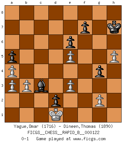 Last move : 0-1 2009 August 10 19:10:15 [Event "FICGS__CHESS__RAPID_B__000122"] [Site "FICGS"] [Date "2009.06.01"] [Round "1"] [White "Yague,Omar"] [Black "Dineen,Thomas"] [Result "0-1"] [WhiteElo "1716"] [BlackElo "1890"] 1.e4 e6 2.Nf3 d5 3.e5 c5 4.Bb5+ Bd7 5.Qe2 Bxb5 6.Qxb5+ Qd7 7.Qxd7+ Nxd7 8.Nc3 a6 9.d3 h6 10.h4 Ne7 11.Bf4 Nc6 12.O-O-O g6 13.Rde1 Bg7 14.Re2 b5 15.Rhe1 O-O 16.h5 g5 17.Bh2 c4 18.dxc4 bxc4 19.Na4 Rab8 20.Re3 Rfc8 21.Kb1 Rb4 22.b3 Bf8 23.Rc1 d4 24.R3e1 Rxa4 25.bxa4 Ba3 26.Ka1 g4 27.Nd2 Bb2+ 28.Kb1 Bc3 29.Re2 Rb8+ 30.Nb3 cxb3 31.cxb3 Nc5 32.Rd1 Nb4 33.Bf4 Nd5 34.Bxh6 d3 35.Re3 Kh7 36.Bg5 Rg8 37.Bh4 Nxe3 38.fxe3 Rc8 39.Be7 d2 40.Bxc5 Rxc5 41.Kc2 Bb4 42.Kd3 Rc1 43.Ke2 Bc3 44.a3 Rxd1 45.Kxd1 a5 0-1 French defense Queenside Castling by player White (move 12) Kingside Castling by player Black (move 15) Player Black won this chess game. Follow this game move after move (download)Different people feel differently about resigning. (Bobby Fischer) Um sich vor der Gefahr einer Erkältung zu schützen, sorge der wanderlustige König beizeiten für ein brauchbares Versteck. (Aaron Nimzowitsch) ¿Cual es el objetivo de jugar una apertura de gambito?... Para adquirir una reputación de ser un jugador apuesto a costo de perder el juego. (Siegbert Tarrasch) La solitude du joueur d'Echecs à l'approche du mat est semblable à celle du condamné. (Francis Szpiner) Creativity is allowing yourself to make mistakes. Art is knowing which ones to keep. (Scott Adams)