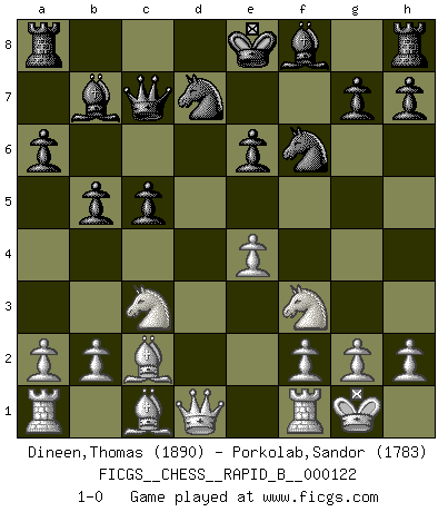 Last move : 1-0 2009 July 27 11:44:32 [Event "FICGS__CHESS__RAPID_B__000122"] [Site "FICGS"] [Date "2009.06.01"] [Round "1"] [White "Dineen,Thomas"] [Black "Porkolab,Sandor"] [Result "1-0"] [WhiteElo "1890"] [BlackElo "1783"] 1.d4 d5 2.c4 c6 3.Nc3 Nf6 4.Nf3 e6 5.e3 Nbd7 6.Bd3 dxc4 7.Bxc4 b5 8.Bd3 Bb7 9.O-O a6 10.e4 c5 11.d5 Qc7 12.dxe6 fxe6 13.Bc2 1-0 This chess game has been lost on time (started : 2009.06.01 10:42:1) QGD Slav defense Kingside Castling by player White (move 9) Player White won this chess game. Follow this game move after move (download)The sign of a great Master is his ability to win a won game quickly and painlessly. (Irving Chernev) Eine Person mit durchschnittlichem IQ kann etwa eine ELO von 2000 erreichen. (Jonathan Levitt) Un sacrificio se refuta mucho mejor al aceptarlo. (Wilhelm Steinitz) À la honte des hommes, on sait que les lois du jeu sont les seules qui soient partout justes, claires, inviolables et exécutées. Pourquoi l'Indien qui a donné les règles du jeu d'échecs est-il obéi de bon gré dans toute la terre, et que les décrétales des papes, par exemple, sont aujourd'hui un objet d'horreur et de mépris ? C'est que l'inventeur des échecs combina tout avec justesse pour la satisfaction des joueurs, et que les papes, dans leurs décrétales, n'eurent en vue que leur seul avantage. L'Indien voulut exercer également l'esprit des hommes et leur donner du plaisir; les papes ont voulu abrutir l'esprit des hommes. Voltaire (Dictionnaire philosophique / Garnier 1967) Tree pose grows confidence. It roots me to this world. (Terri Guillemets)