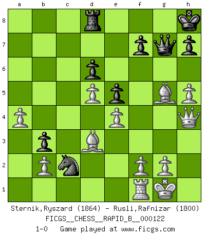 Last move : 1-0 2009 June 15 15:58:8 [Event "FICGS__CHESS__RAPID_B__000122"] [Site "FICGS"] [Date "2009.06.01"] [Round "1"] [White "Sternik,Ryszard"] [Black "Rusli,Rafnizar"] [Result "1-0"] [WhiteElo "1864"] [BlackElo "1800"] 1.e4 c5 2.Nf3 Nc6 3.d4 cxd4 4.Nxd4 e5 5.Nb5 d6 6.N1c3 a6 7.Na3 b5 8.Nd5 Nf6 9.c4 b4 10.Nxf6+ Qxf6 11.Nc2 Qg6 12.Qd5 Bd7 13.h4 Rc8 14.h5 Qf6 15.Qd1 a5 16.Ne3 Be6 17.Nd5 Bxd5 18.cxd5 Nd4 19.Qa4+ Ke7 20.Bd3 Rc5 21.Be3 g5 22.Rc1 Rxc1+ 23.Bxc1 Bh6 24.Qxa5 Rc8 25.O-O b3 26.a4 g4 27.Be3 Nc2 28.Qa7+ Kf8 29.Qd7 Rd8 30.Bxh6+ Kg8 31.Qxg4+ Kh8 32.Bg5 Qg7 33.Qh4 1-0 Sicilian : Labourdonnais-Loewenthal (Kalashnikov) variation Kingside Castling by player White (move 25) Player White won this chess game. Follow this game move after move (download)As one by one I mowed them down, my superiority soon became apparent. (Jose Capablanca) Wenn ein Kopf und ein Buch zusammenstoßen und es klingt hohl, ist es denn allemal im Buche? (Georg Christoph Lichtenberg) Prefiero perder una partida realmente buena, que ganar una mala. (David Levy) Votre prénom est 'Tactique', votre deuxième prénom est 'Tactique' et votre nom est 'Tactique'. (Ken Smith) Ah, the Socrating method. The best way we have of teaching everything-apart from juggling chainsaws. (Gregory House, House M.D.)