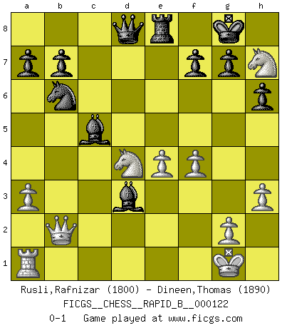 Last move : 0-1 2009 June 15 15:25:9 [Event "FICGS__CHESS__RAPID_B__000122"] [Site "FICGS"] [Date "2009.06.01"] [Round "1"] [White "Rusli,Rafnizar"] [Black "Dineen,Thomas"] [Result "0-1"] [WhiteElo "1800"] [BlackElo "1890"] 1.d4 Nf6 2.c4 e6 3.Nf3 d5 4.Nc3 Be7 5.e3 O-O 6.Bd3 c5 7.O-O Nc6 8.cxd5 exd5 9.dxc5 Bxc5 10.a3 Re8 11.Qc2 Bg4 12.Ng5 h6 13.Nh7 Be7 14.h3 Be6 15.Rd1 Nd7 16.b4 Rc8 17.f4 d4 18.Ne2 Nxb4 19.Qb1 Nxd3 20.Rxd3 Bf5 21.Nxd4 Rxc1+ 22.Qxc1 Bxd3 23.Qb2 Nb6 24.e4 Bc5 0-1 Queen's pawn game Kingside Castling by player Black (move 5) Kingside Castling by player White (move 7) Player Black won this chess game. Follow this game move after move (download)When you play Bobby, it is not a question if you win or lose. It is a question if you survive. (Boris Spassky) Du musst Deinen Gegner in einen tiefen dunklen Wald führen wo 2+2=5 ist und wo der Weg, der wieder hinausführt, nur breit genug für einen ist. (Mikhail Nekhemyevich Tal) El jugador táctico sabe que hacer cuando hay algo que hacer; mientras que el estratega sabe que hacer cuando no hay nada que hacer. (Gerald Abrahams) Mais l'homme est une créature légère et illogique : semblable au joueur d'échecs, il n'aime que le processus du but à atteindre, non le but lui-même. (Dostoïevsky) Luck is the residue of design. (John Milton)