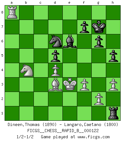 Last move : 1/2-1/2 2009 July 8 22:37:35 [Event "FICGS__CHESS__RAPID_B__000122"] [Site "FICGS"] [Date "2009.06.01"] [Round "1"] [White "Dineen,Thomas"] [Black "Langaro,Caetano"] [Result "1/2-1/2"] [WhiteElo "1890"] [BlackElo "1800"] 1.d4 d5 2.c4 e6 3.Nc3 Nf6 4.cxd5 exd5 5.Bg5 Nbd7 6.e3 Be7 7.Bd3 O-O 8.Nge2 Re8 9.Qc2 c6 10.O-O Nf8 11.f3 Be6 12.Rad1 Rc8 13.a3 a6 14.Na4 N6d7 15.Bxe7 Qxe7 16.b4 a5 17.bxa5 Qxa3 18.Rb1 Rc7 19.Rfc1 Qe7 20.Qd2 Nf6 21.Rc3 g6 22.Nf4 Bc8 23.Bc2 Ne6 24.Nd3 Ng7 25.a6 bxa6 26.Ne5 Nd7 27.Nxc6 Qd6 28.Na5 Ne6 29.Rxc7 Nxc7 30.Rc1 Nb5 31.Bb3 Kg7 32.Nb2 Qe7 33.Nd1 Nf6 34.Bc2 Nd6 35.Bd3 Bd7 36.Nc6 Qe6 37.Bxa6 Nf5 38.Nb4 Nxe3 39.Nxe3 Qxe3+ 40.Qxe3 Rxe3 41.Bd3 Re8 42.Rc5 Re1+ 43.Kf2 Rd1 44.Ke3 Be6 45.h3 Rg1 46.Rc2 Re1+ 47.Re2 Ra1 48.Rb2 Ne8 49.Nc2 Rh1 50.Ra2 h5 51.Ra8 Nd6 52.Nb4 1/2-1/2 QGD : Exchange, positional line Kingside Castling by player Black (move 7) Kingside Castling by player White (move 10) This chess game ended in a draw. Follow this game move after move (download)Chess, like love, is infectious at any age. (Flohr) Nie in meinem Leben habe ich die französische Verteidigung gespielt, welche die Stumpfsinnigste von allen ist. (Wilhelm Steinitz) Evita las multitudes. Haz independientemente tu propio razonamiento. Trata de ser el jugador de Ajedrez, no la pieza de Ajedrez. (Ralph Charell) La vérité est comme le meilleur coup aux échecs : elle existe, mais il faut la chercher. (Arturo Perez-Reverte) Faith : not wanting to know what is true. (Friedrich Nietzsche)